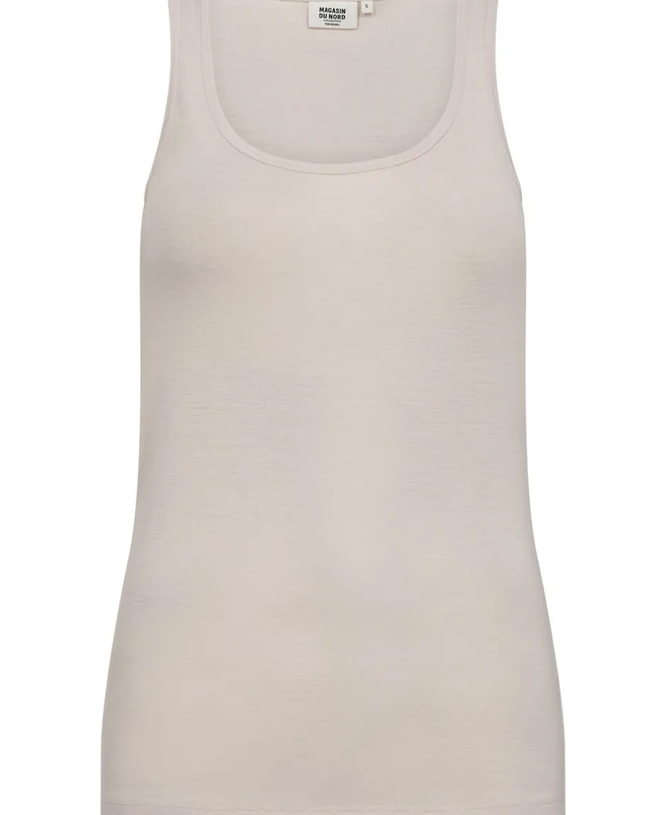 Top fra Magasin du Nord Collection i den blødeste kvalitet af 100% uld med RWS- og OEKO-TEX® STANDARD 100-certificering. Toppen er enkel i modellen med brede skulderstropper, en smal ribkant i den runde halsudskæring samt en komfortabel, tætsiddende pasform. En skøn top i den absolut lækreste kvalitet.