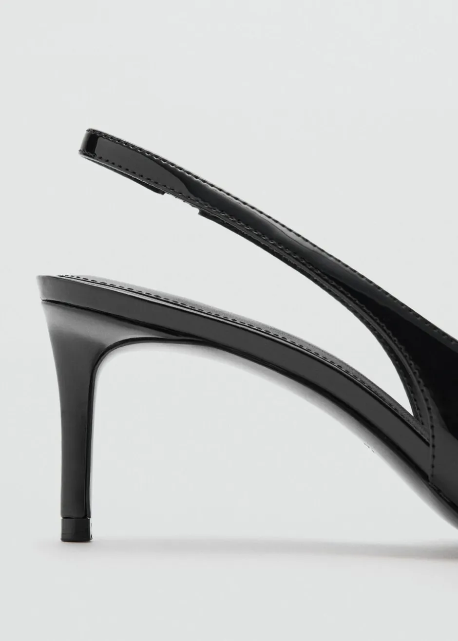 Patentlædereffekt, Slingback-Design, spids, dekorativt rundt metalstykke, Stiletto-hæl, Ingen lukning, 6 cm hæl.