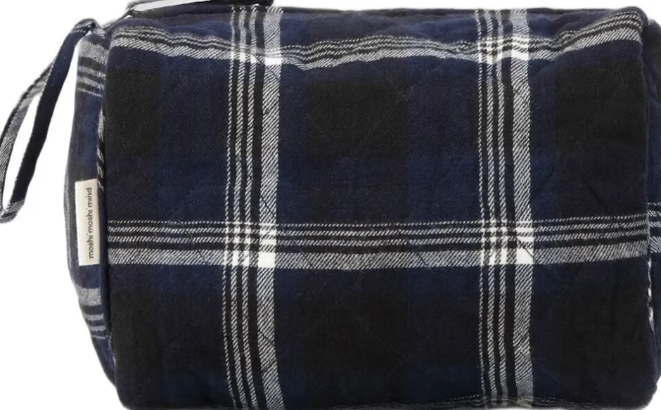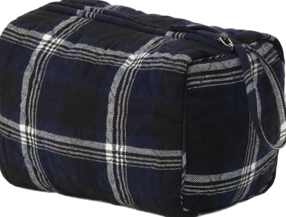 Vatteret toilettaske i quilted design. Rejsetoilettasken har dekorative blå tern. Brug den når du rejser som makeuptaske eller toilettaske, eller derhjemme til opbevaring på badeværelset.
