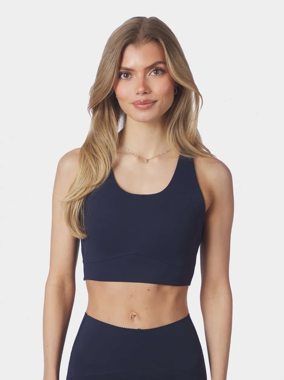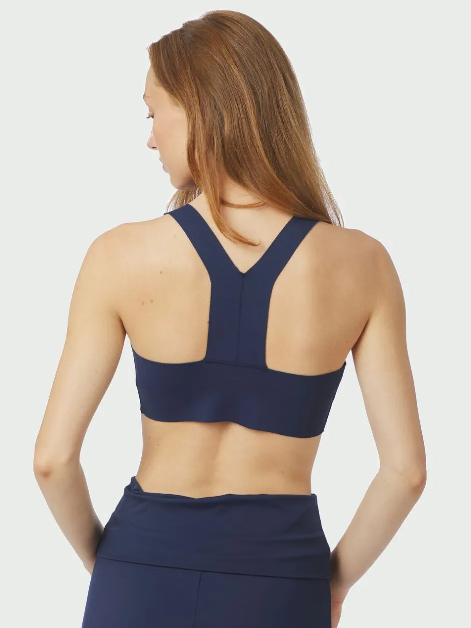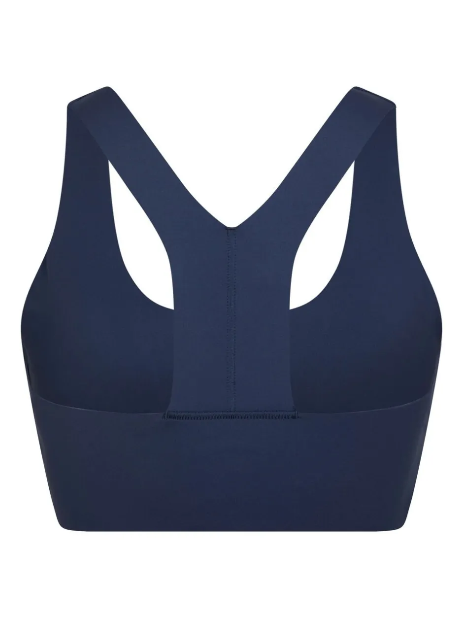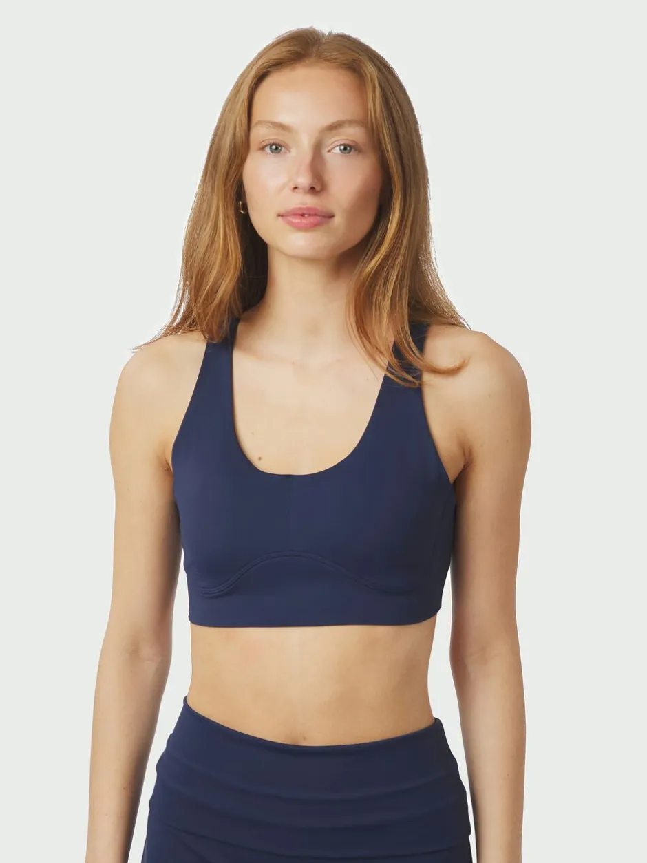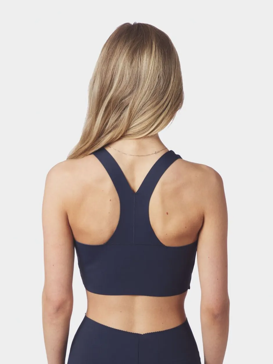 Kort sportstop. Toppen har rund halsudskæring, racerback-design og dekorative syninger. Den har brede stropper, som giver god støtte under aktivitet. Pasformen er tætsiddende, og den er fremstillet i et strækbart materiale. Modellen bærer størrelse 36.