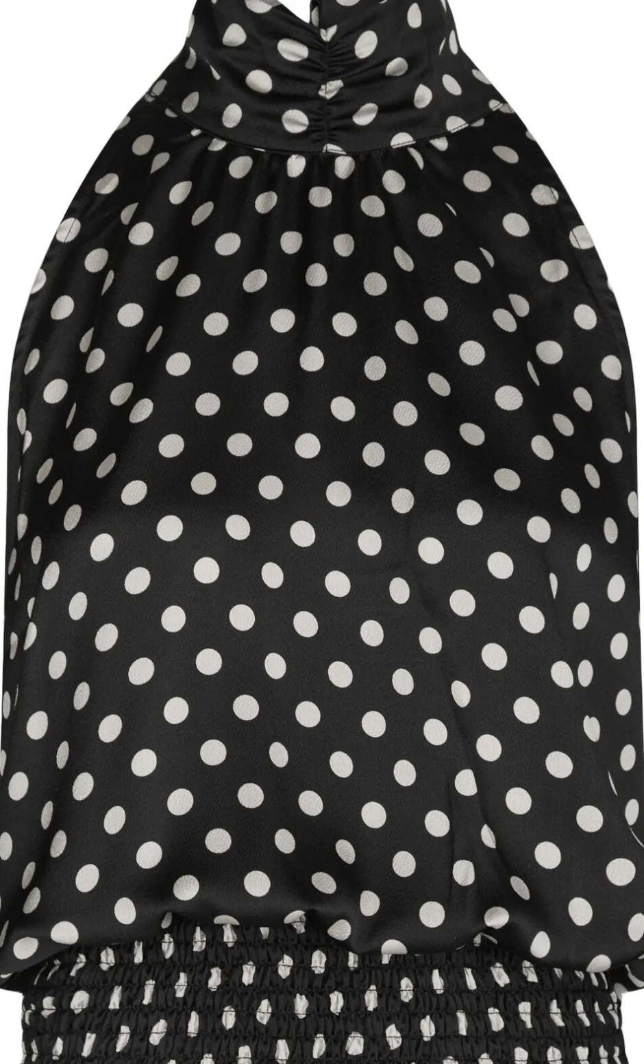 Kort halterneck-top med polkaprikker. Toppen har høj hals, smock i taljen og lukkes med bindebånd i nakken. Den har en almindelig pasform. Modellen er iført størrelse 36.