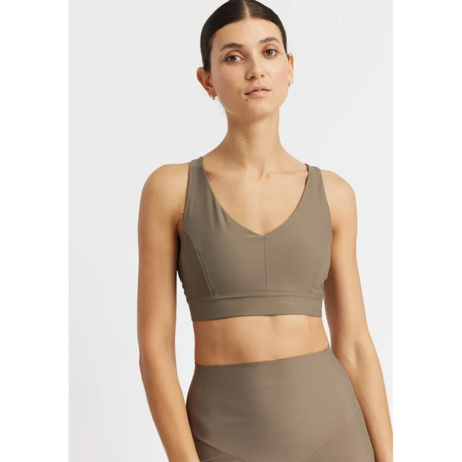 Detaljer: Sports-bh i blødt Recycled med aftagelige indlæg. Bh’en er figursyet og har tykkere stropper, der bliver tyndere og krydser på ryggen i et skønt mønster. Den har en blød linning forneden og en bred elastik indvendigt, der sikrer en god pasform. Som en cool detalje har bh’en et indgraveret logo på linningen. Det tidløse og sømløse look gør denne sports-bh til en uundværlig del af enhver garderobe. Den er behagelig at have på og bevæge sig i. Den er perfekt til fitness, løb og bløde sportsgrene eller som en del af din daglige garderobe.
