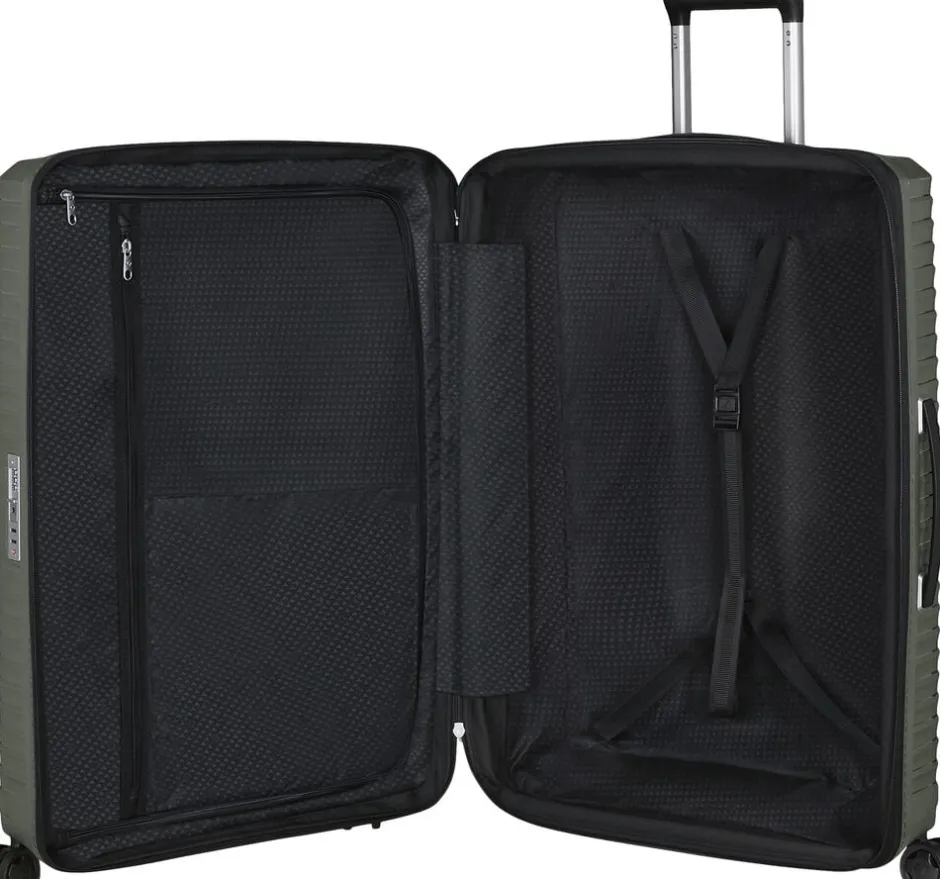 Kuffert med mulighed for udvidelse, polypropylen,4 hjul,TSA lås , indvendig stofforring lavet af genbrugte plastflasker, dobbelt trollystativ,navneskilt, vægt 3,4 kg,rumindhold 104/114l, 5 års garanti, 75x51x30/33 cm.