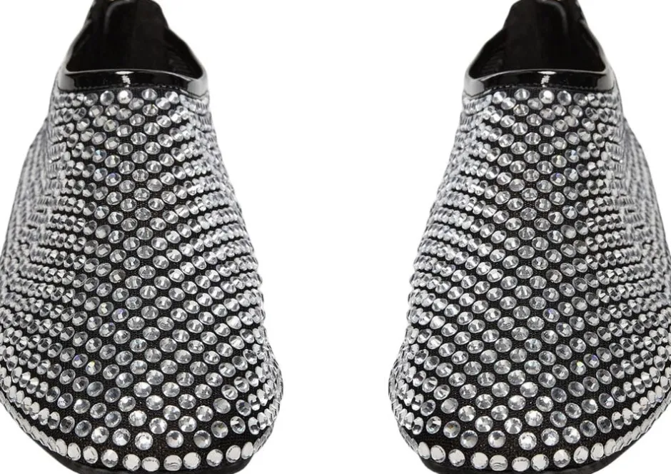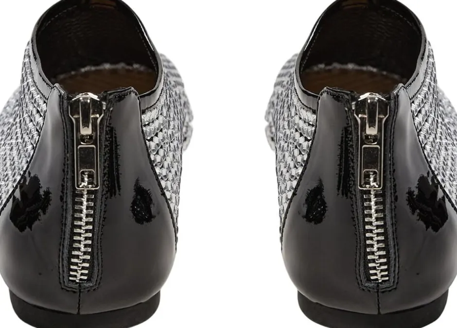 • Ballerina i mesh • Dækket med rhinsten • Rund tå • Lynlåslukning bagpå • Sort lakeret look • Flad sål • 85% mesh, 15% læder