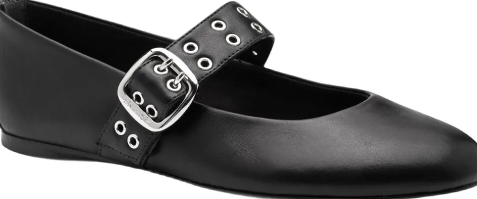 Rundsnudet flad ballerina i sort skind look med stort sølv spænde