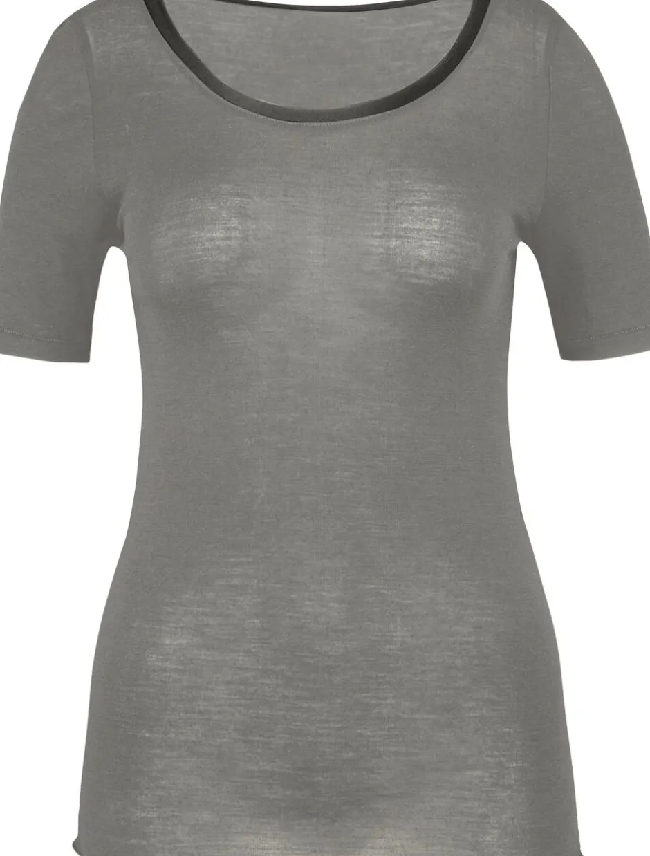 T-shirt fra Calida i den blødeste og fineste kvalitet bestående af lammeuld og silke. T-shirten er enkel i modellen med en tætsiddende pasform, en rund halsudskæring med en fin silkekant, korte ærmer samt fine bølger langs bundkanten. En skøn T-shirt i den bedste kvalitet.
