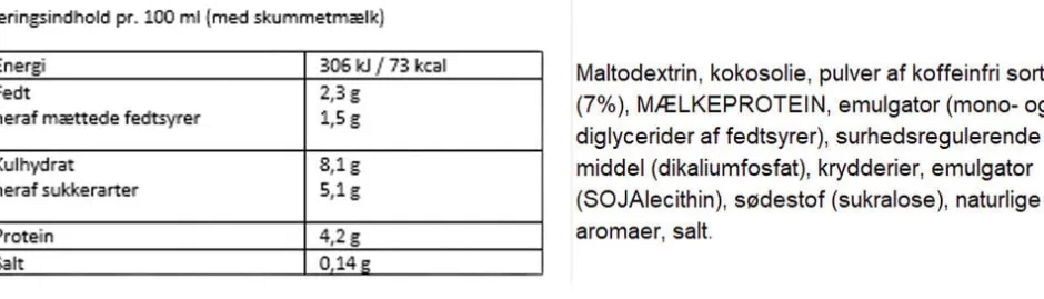 Maltodextrin, kokosolie, pulver af koffeinfri sort te (7%), MÆLKEPROTEIN, emulgator (mono- og diglycerider af fedtsyrer), surhedsregulerende middel (dikaliumfosfat), krydderier, emulgator (SOJAlecithin), sødestof (sukralose), naturlige aromaer, salt. Flamingo Vanilla er en både koffeinfri og sukkerfri chai. Det er en fyldig og cremet blanding af koffeinfri sort te og skønne krydderier som kanel, kardemomme og vanilje. Blandingen er sødet med Splenda. Tilberedes med varmt vand eller mælk