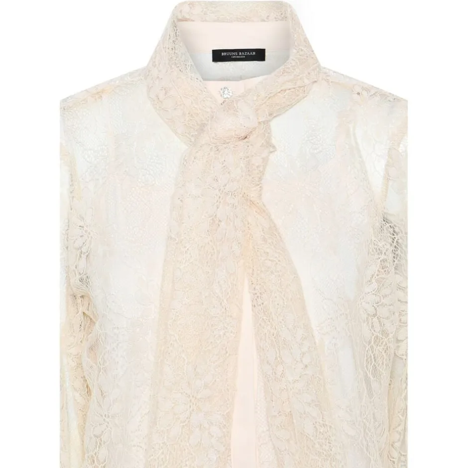 BugleBBOmassa bluse er en elegant blondebluse, der kombinerer sofistikeret Design med feminine detaljer. Det lette, gennemsigtige stof skaber et Exclusive look, mens den fastgjorte bindebånd i nakken tilføjer et klassisk og romantisk tvist. Style den med en enkel nederdel eller bukser for et tidløst outfit, eller brug den under en blazer for et mere formelt look. Et ideelt valg til både festlige lejligheder og elegante hverdagslooks. – Blondestof – Bindebåndsdetalje i halsen – Gennemsigtigt Design – Lange ærmer med manchetter – Feminint og tidløst udtryk