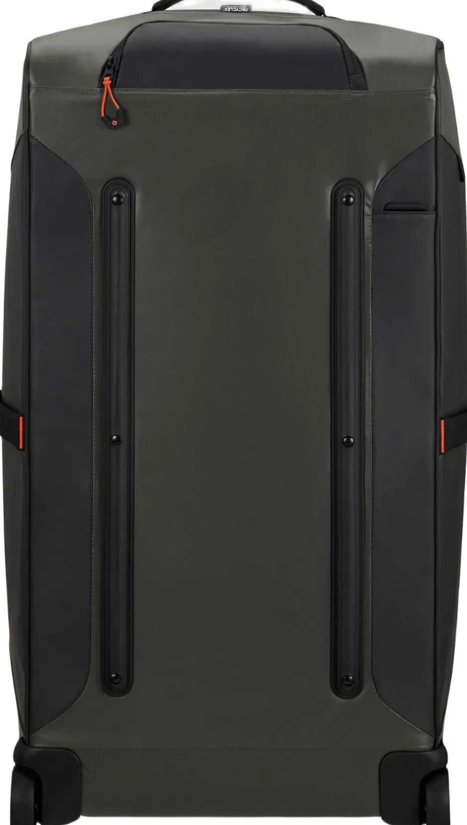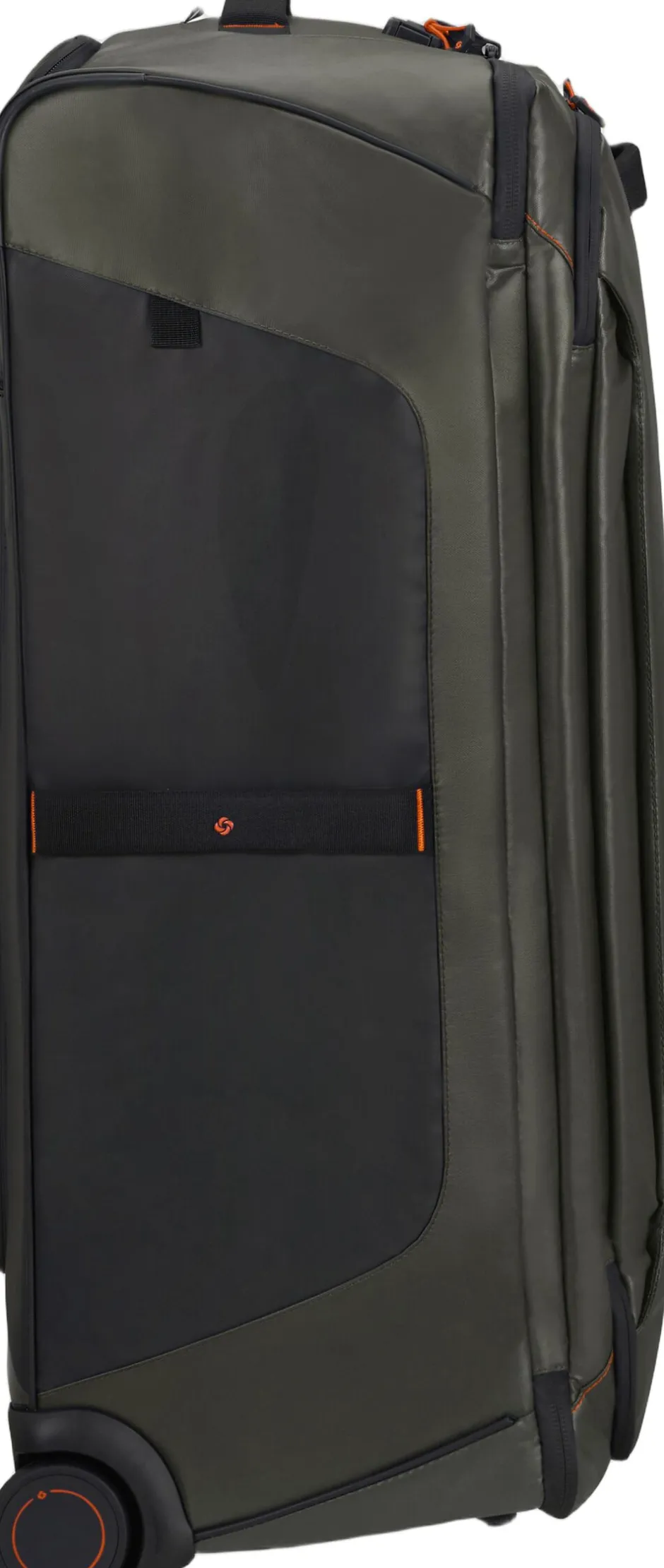 Duffle på hjul hvor både det udvendige og indvendige stof er lavet af genbrugt nylon og polyester, vandafvisende materiale, front og sidelomme, TSA lås, rumindhold 122 liter, vægt 3,4 kg. 5 års begrænset garanti.