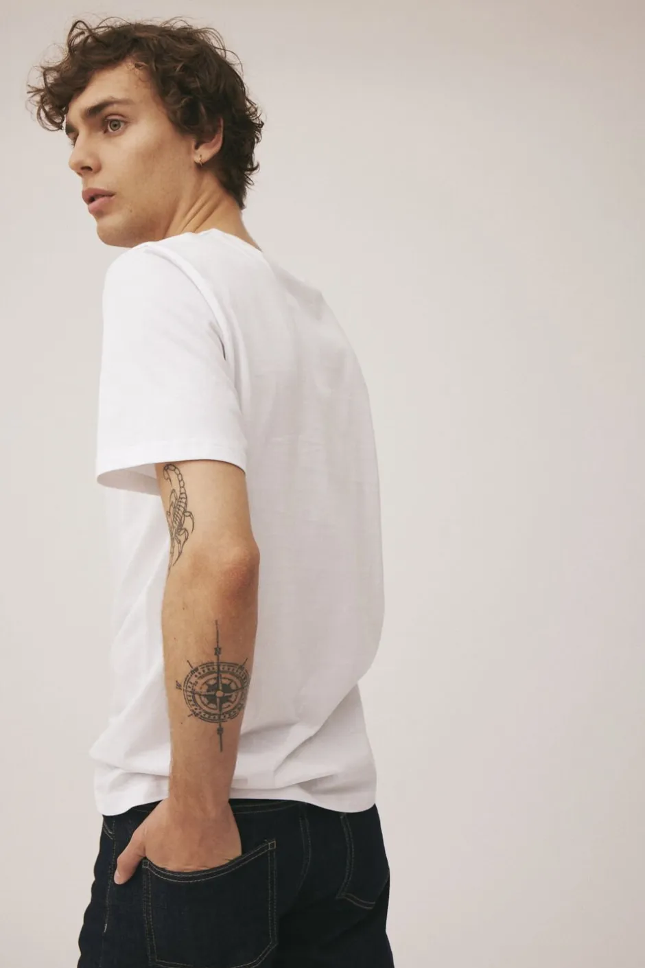 T-shirt fra Magasin du Nord Collection i den blødeste kvalitet af 100% økologisk bomuld med GOTS-certificering. T-shirten er enkel i modellen med korte ærmer, en smal ribkant langs den runde halsudskæring samt en løs pasform. En klassisk T-shirt i den lækreste kvalitet. Global Organic Textile Standard (GOTS) certificeringen sikrer en sporbar forsyningskæde af økologisk materiale, der overholder strenge miljø- og kemikrav samt ordentlige arbejdsforhold i alle led. Økologisk materiale kommer fra landbrug, hvor man arbejder med naturen på en måde så både økosystemer og biodiversitet opretholdes. Det betyder, at der ikke benyttes giftige kemikalier, at vandforbruget begrænses og at der i højere grad anvendes regnvand i produktionen.