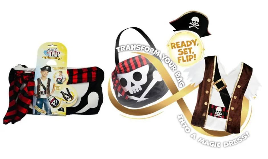 Magic Flip ? hvor fantasien udfolder sig! En sej pirattaske forvandles magisk til et fedt piratkostume Dette sæt inkluderer desuden også en pirathat Størrelse 5-6 år