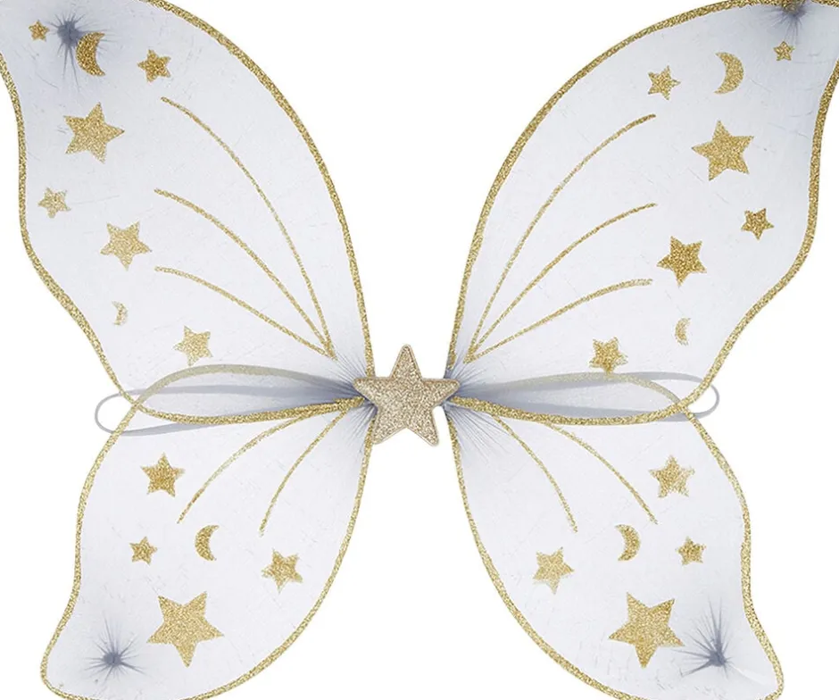 Fevinger med elastikstrop og måner og stjerner i guldglitter på en baggrund af svagt gråt stof.