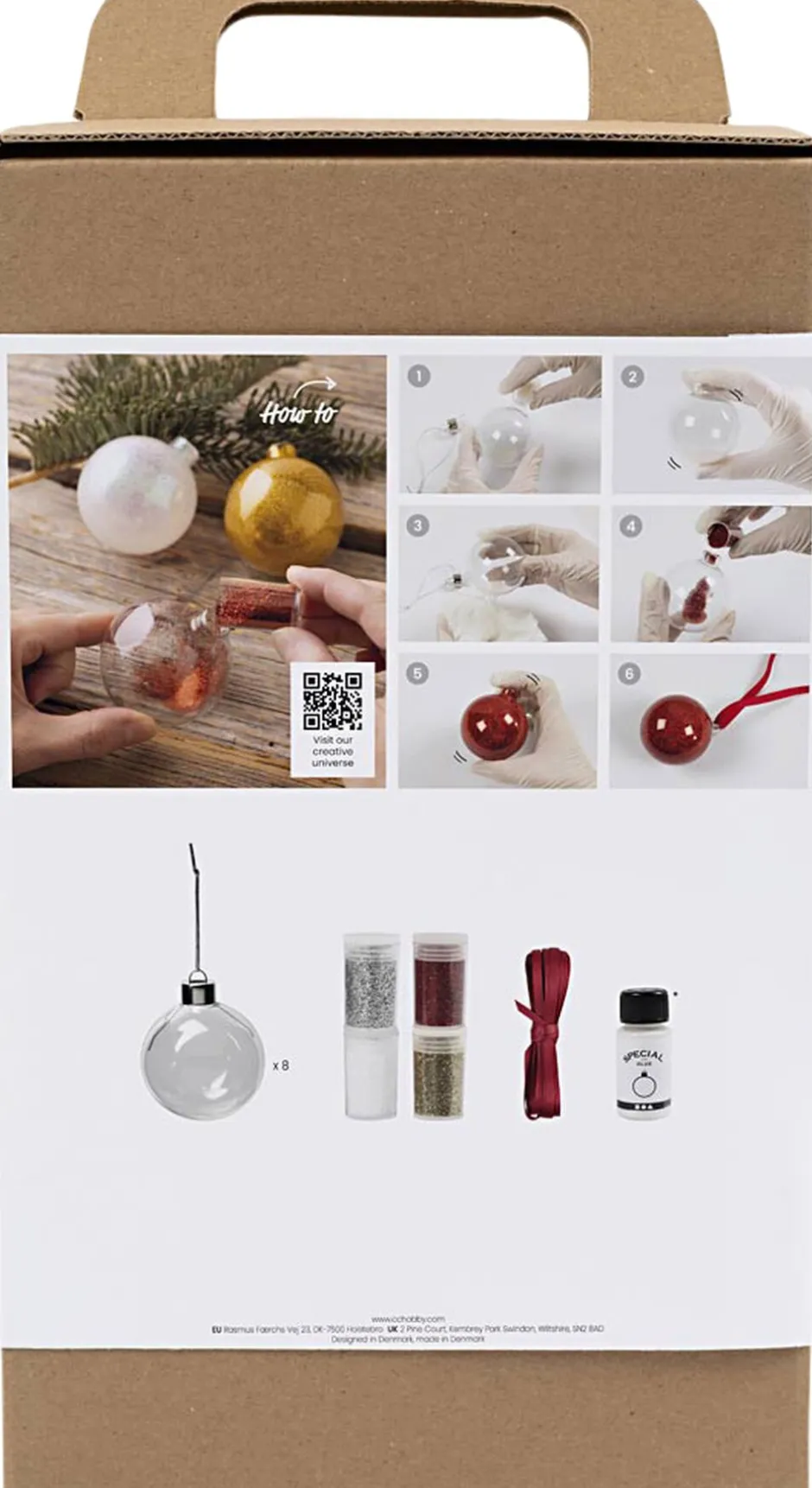 Med dette kit kan du lave flotte julekugler med glitter. Indeholder alle de materialer du skal bruge, og al den vejledning du behøver. Vil du lave magiske julekugler, er dette kit lige noget for dig. Du får materialer nok til otte julekugler i glas. Først dekorerer du med glitteret indvendig og bagefter hænger du dem op med klassisk, rødt bånd. Resultatet bliver de fineste julekugler til juletræet.