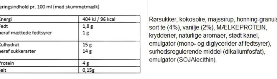 Ingredienser: Rørsukker, kokosolie, majssirup, honning-granulat, sort te (4%), vanilje (2%), MÆLKEPROTEIN, krydderier, naturlige aromaer, stødt kanel, emulgator (mono- og diglycerider af fedtsyrer), surhedsregulerende middel (dikaliumfosfat), emulgator (SOJAlecithin). Sort te blanding tilsat kardemomme, nellike, kanel, ingefær, honning samt skøn Madagascar Bourbon Vanilla. Tilberedes med varmt vand eller mælk.