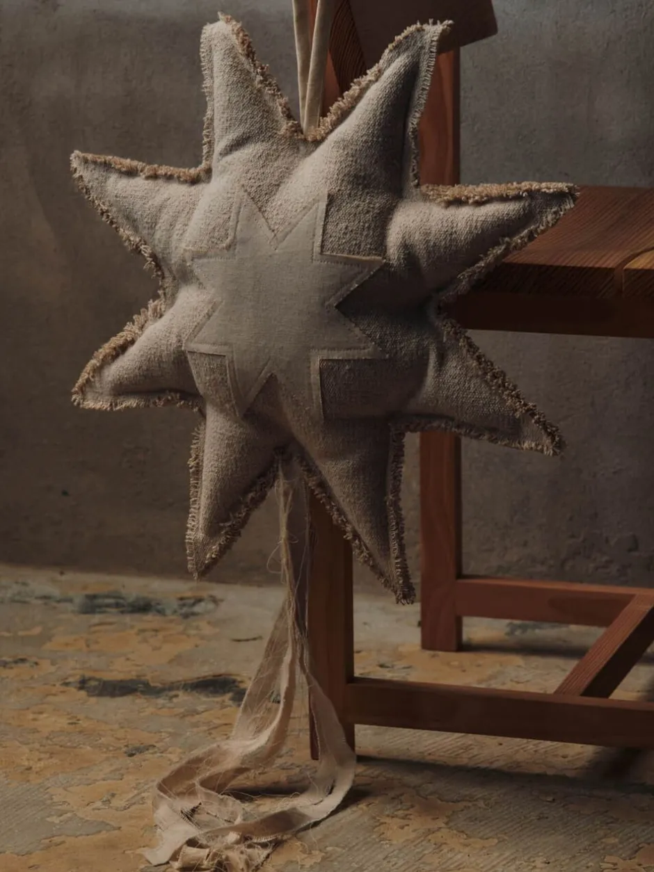 Vela-vinduespynt er fremstillet af naturligt, ufarvet økologisk bomuldslærred, der fremkalder den nostalgiske charme fra hjemmelavede juledekorationer. Stjernen har fine, flossede kanter, der giver en rustik charme, og har en mindre stjerne sat på i midten. Den er fyldt med genanvendt polyester, der giver dimension og et blødt udtryk, og er perfekt i et vindue eller andre steder i hjemmet.