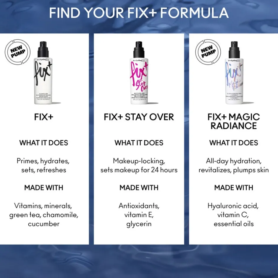 – Til ansigtsprodukter, påfør din foretrukne pudderfoundation og spray let over hele ansigtet for at fiksere og fugte.