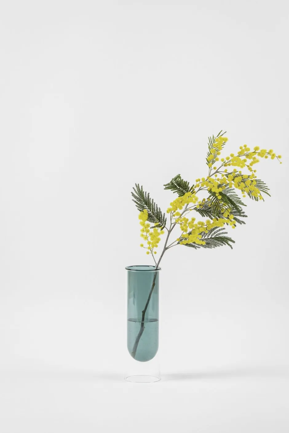 FLOWER TUBE kollektionen er en serie af cylinderformede vaser tegnet til små buketter og enkelte blomster. De er dog også smukke med forårsgrene fra haven eller stikliger, så du kan former din yndlingsplante. Vaserne fås i 2 størrelser og består af et gennemsigtigt ydre og et farvet indre, der udgør selve vasen. Denne vase er i farven cyan og mundblæst i glastypen borosilikatglas. SMUKKE FARVER TIL DIT HJEMVasen findes her i en smuk turkis farve. Det transparente ydre giver vasen et svævende og let udtryk. Farvet glas er populært i indretningen og er en nem måde at få farver trukket indedøre. Flower tube vaserne fås udover turkis også i rosa, grøn, blå og gul m.fl. og inviterer til, at man mikser dem på tværs af både farver og højde. De er også smukke enkelt ståen i fx. i en reol eller på badeværelseshylden. Brug vasen med en enkelt blomst eller to, evt. i samme nuance som vasen eller prøv dig frem med mere volumniøse blomster som eksempelvis en orkidé. Vaserne bringer elegance til et smukt dækket bord, men kan også bruges som et æstetisk pift på reolen. Vælger du tørrede blomster eller papirblomster til vasen har du både noget smukt for øjet og noget der ikke kræver pasning. Vi har i samarbejde med kunsteren Labdecor tegnet flere papirblomster i crepepair, der passer perfekt til vores vaser. DANSK DESIGN I BOROSILIKATGLASCylindervaserne er håndlavede i borosilikatglas, som er lettere og stærkere end almindeligt glas. Det kan modstå høje temperaturer og er desuden ridsefast, så du behøver altså ikke være bange for at vasen sprænger eller er sart. Kollektionen af vaser gøres nemmest rent med varmt vand og sæbe. Tilføj gerne lidt almindelig eddike til sæbeblandingen. Se også serien af boblevaser til bordet, som også kan mikses med Flower Tubes og dette mix er oplagt til et stort smukt sommerbord med blomster og lækkert mad.MÅL, VÆGT OG FARVEÅBNING: Ø65 mmHØJDE: H200 mmVÆGT: inkl. emballage 0,460 kgFARVE: CyanStudio About er et dansk designstudio. Alle objekter er designet af arkitekt Mikkel Lang Mikkelsen