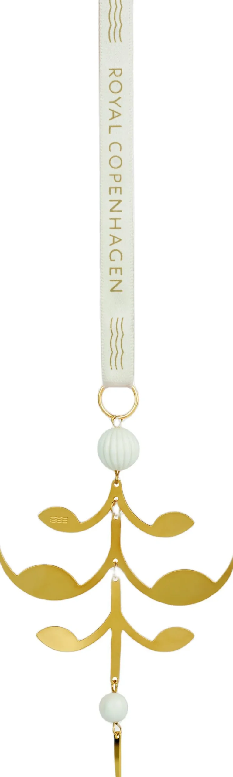 Dette forgyldte ornament prydes af et palmetteelement, der kendes fra det ikoniske Musselmalet Riflet mønster. De fire adskilte dele skaber en let bevægelse og blide gyldne refleksioner, når ornamentet fanger lyset. Perlerne er fremstillet af fint riflet porcelæn.
