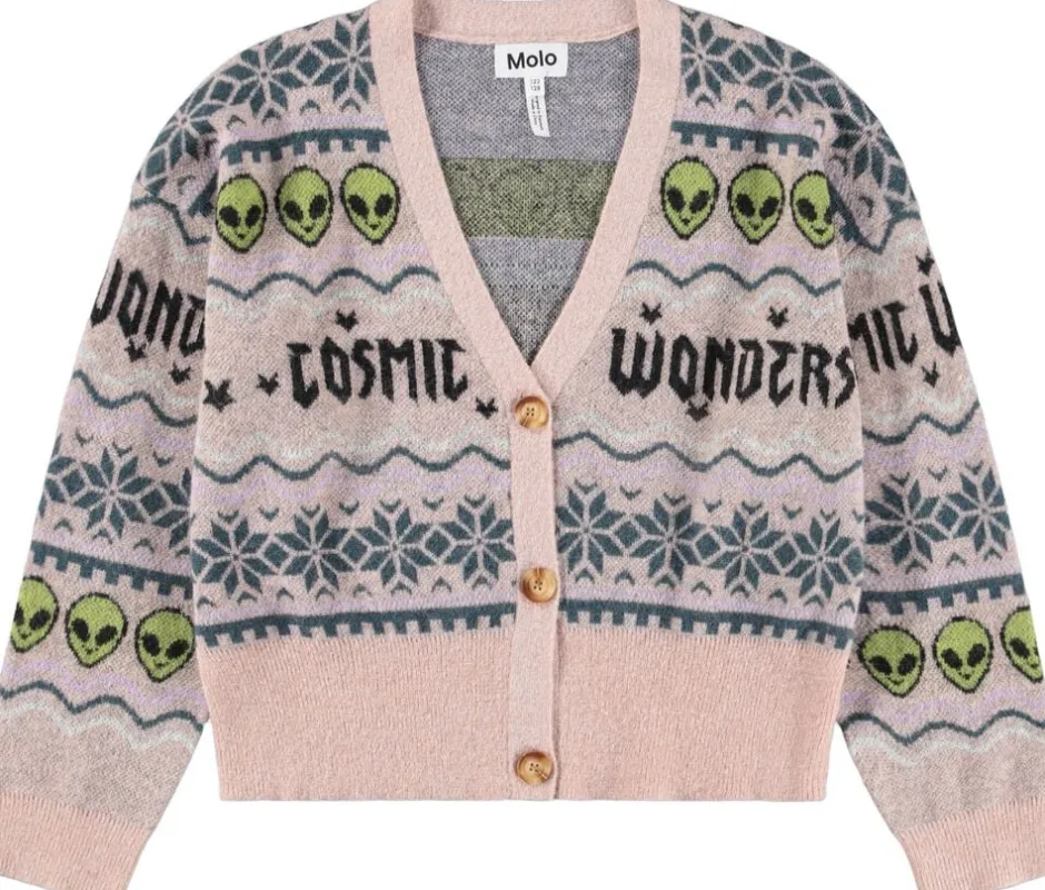Denne flotte cardigan fra Molo er lavet i en blanding af uld og alpaka. Den har et farvestrålende mønster inspireret af nordisk strikkehistorie med små alien og teksten ‘Cosmic Wonder’. Cardiganen har V-udskæring, ribafslutning og fine knapper foran.