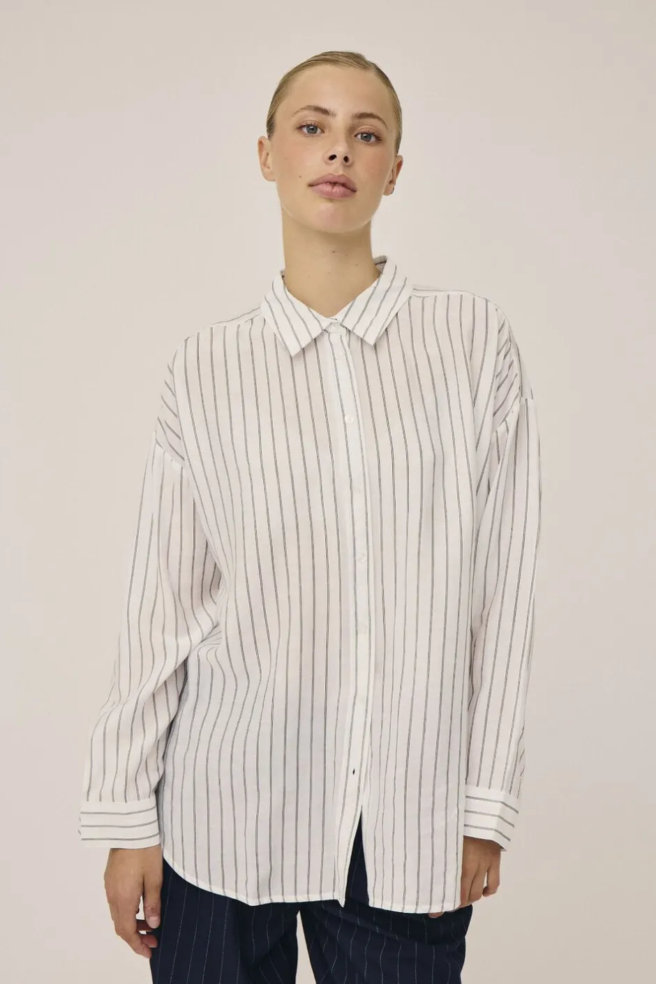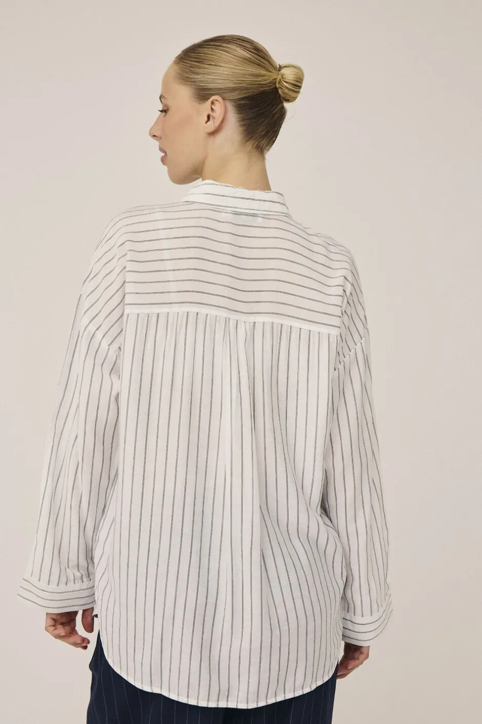 - Farve:Off white and black pinstripe