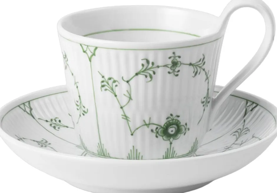 Gør din te- eller kaffestund til noget særligt med denne smukke højhankskop med underkop, hvor der er plads til en småkage som en lille forkælelse. Den hvide, riflede kop er smukt dekoreret med en underspillet, grøn farve, der tilfører et elegant udtryk, understreget af det klassiske og tidsløse musselmalede mønster.