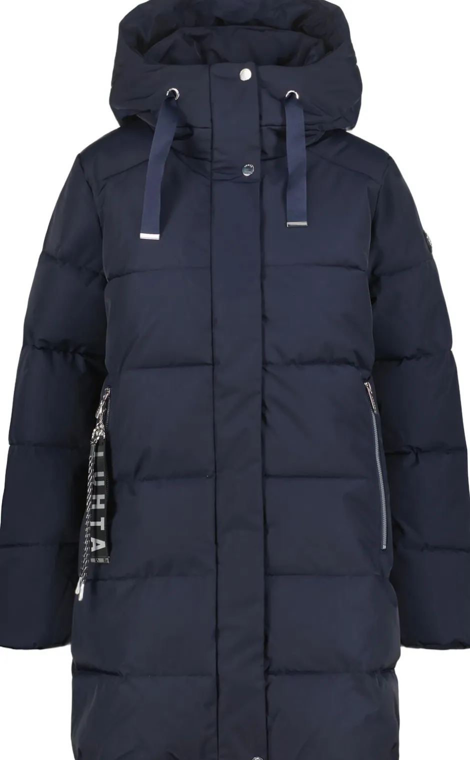 Luhta Downlook frakke til kvinder. Løs pasform. Justering af hætte med snoretræk. Fast hætte. Elastiske manchetter. To forlommer med lynlås. Indvendig lynlåslomme. Tovejs lynlås foran. Vindstolpe med trykknapper. Elastisk kant. Aftagelig udsmykning. Logo-mærkat. Vandsøjle 10.000 mm. Åndbar 5.000 g/m2/24t. Indeholder REPREVE®-polyester fremstillet af 100 % Recycled materialer, herunder plastflasker fra forbrugeraffald. Ved udformningen af dette A.W.S. ACTIVE-produkt er der lagt særlig vægt på funktionalitet og komfort, så produktet er velegnet til både aktiv og afslappet brug. Polstringen er lavet af dunimiation, der giver fremragende varmeisolering i forhold til dens lette vægt. Stoffets overflade er behandlet med en vandskyende finish. Dette vindtætte materiale giver optimal vindbeskyttelse og varme. Varm isolering. Indeholder Recycled materiale. Stoffets overflade er behandlet med en vandskyende finish. Aftagelig udsmykning. Elastisk kant. Logo-mærkat
