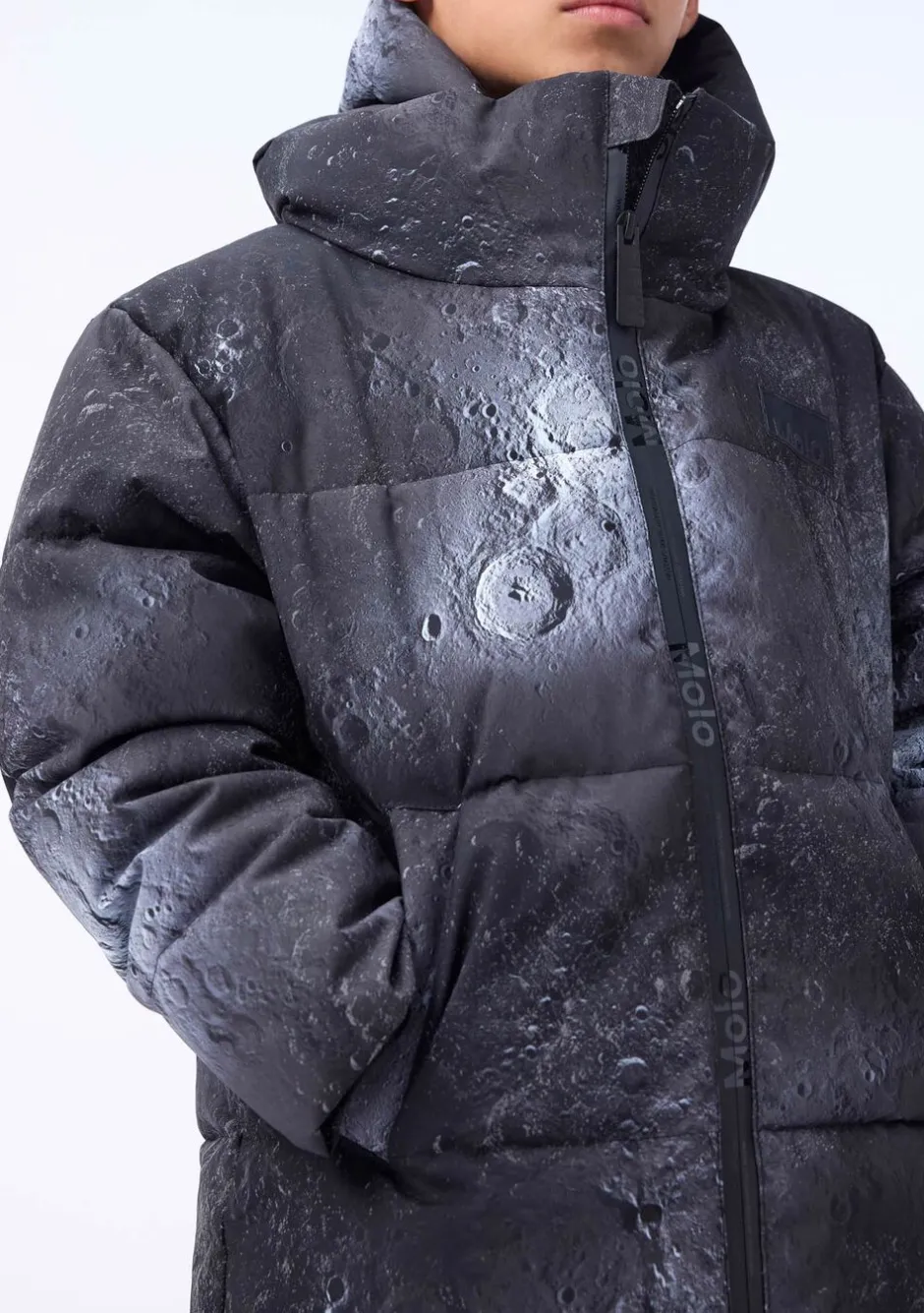 Denne jakke fra Molo er lavet i genanvendt polyester og har et print af snowboardere i alperne. Jakken har en praktisk lynlåslukning, høj krave, aftagelig hætte, frontlommer, en indvendig lomme, ribkant ved håndleddene og en justerbar elastik i bunden. Bagpå er der en stor refleks.