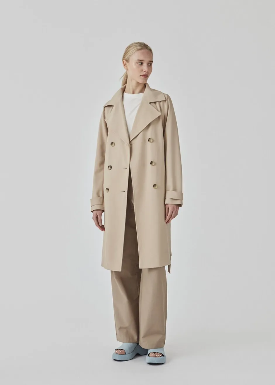 Smuk jakke med i et klassisk udtryk bred krave, bælte i livet og knaplukning. Hiro jacket er perfekt som overgangsjakke fra vinter til forår. Jakken har en rummelig pasform. Vi anbefaler at gå en størrelse ned.
