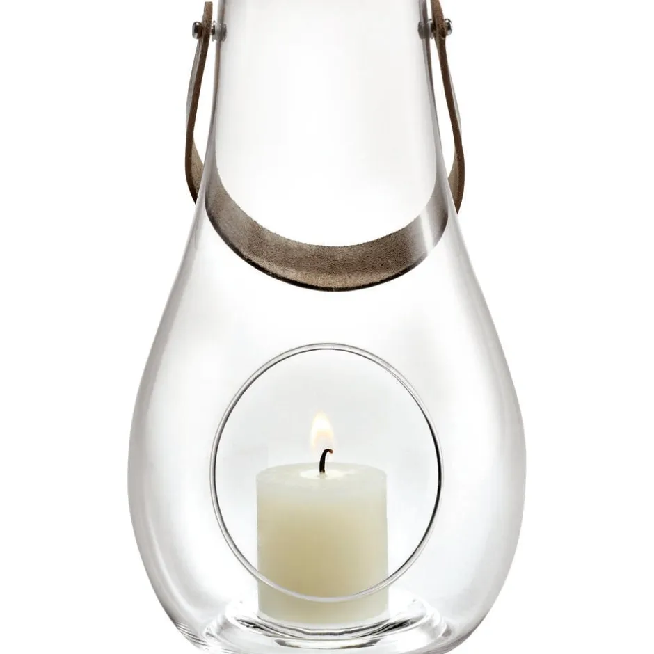 Design with Light lanternen, her den mellemstore version klart glas på 24,8 cm, gør de særlige øjeblikke endnu smukkere – både indenfor og ude. Designet af Maria Berntsen skaber Design with Light lanternen et stemningsfuldt levende lysskær på altan og terrasse. De mundblæste lanterner findes også i frostet glas med det karakteristiske læderhåndtag. Den runde åbning er håndlavet af Holmegaards erfarne kunsthåndværkere og gør hver lanterne unik.