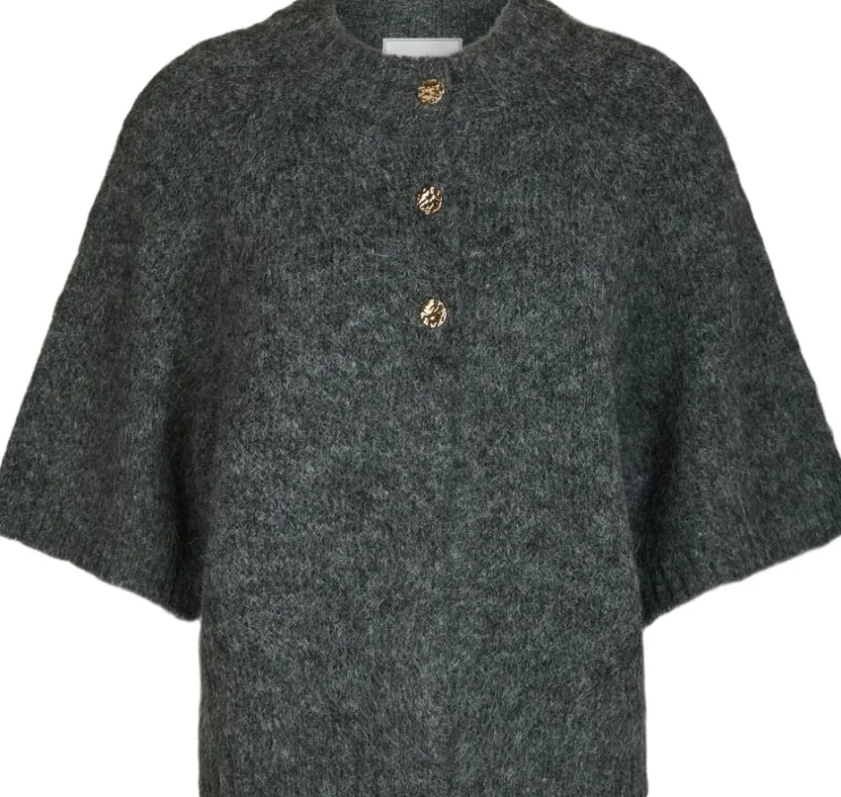 Cardigan med korte ærmer. Cardiganen har en rund halsudskæring, ærmer med vidde og en åben front med tre dekorative knapper. Den er lavet i en blød, fluffy kvalitet og har en løs pasform. Modellen er iført størrelse 36.