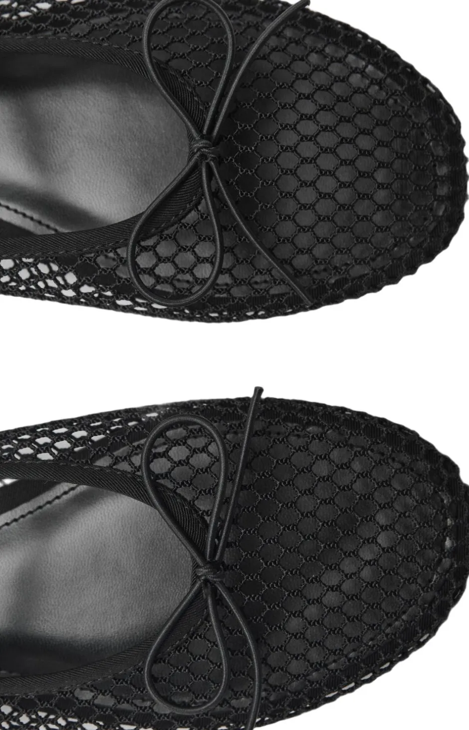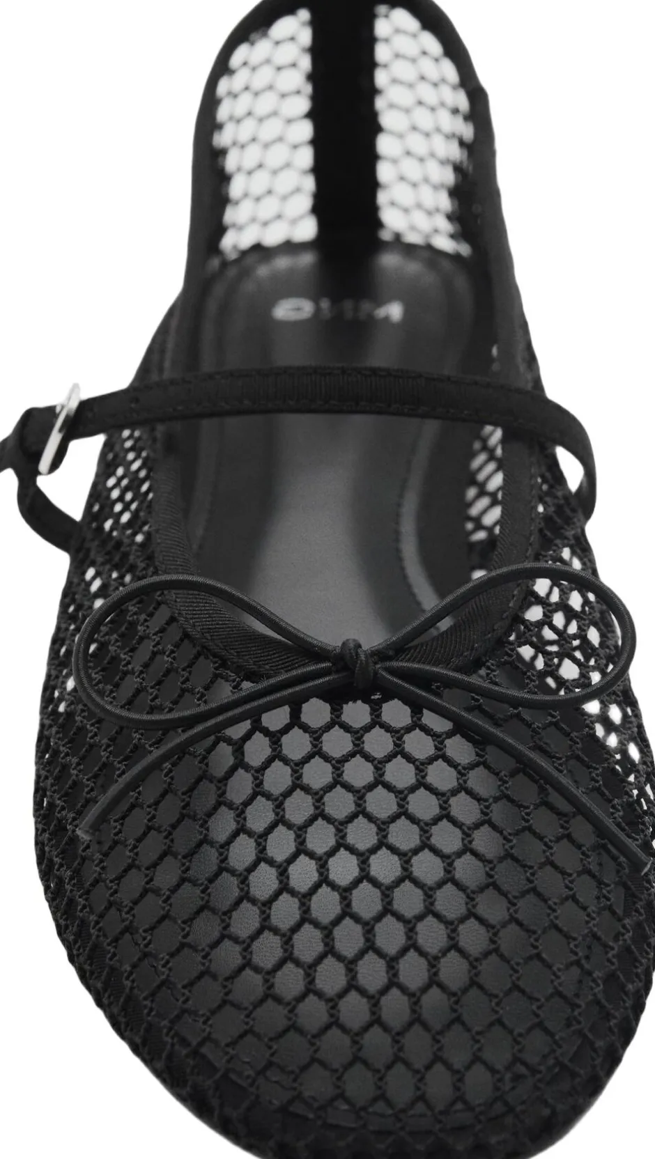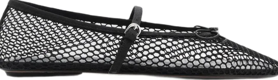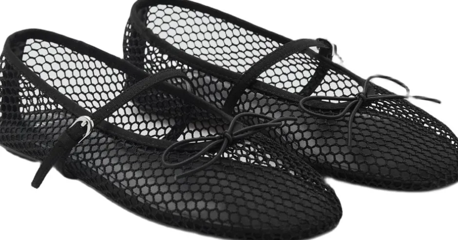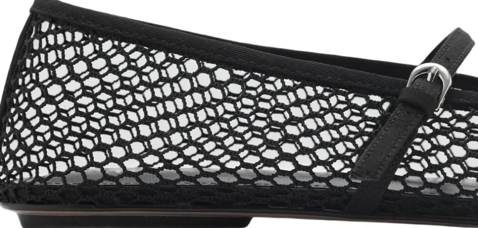 Meshstof, Fishnet-Design, flad, rund tå, dekorativ sløjfe, stroplukning med spænde, indvendig foring