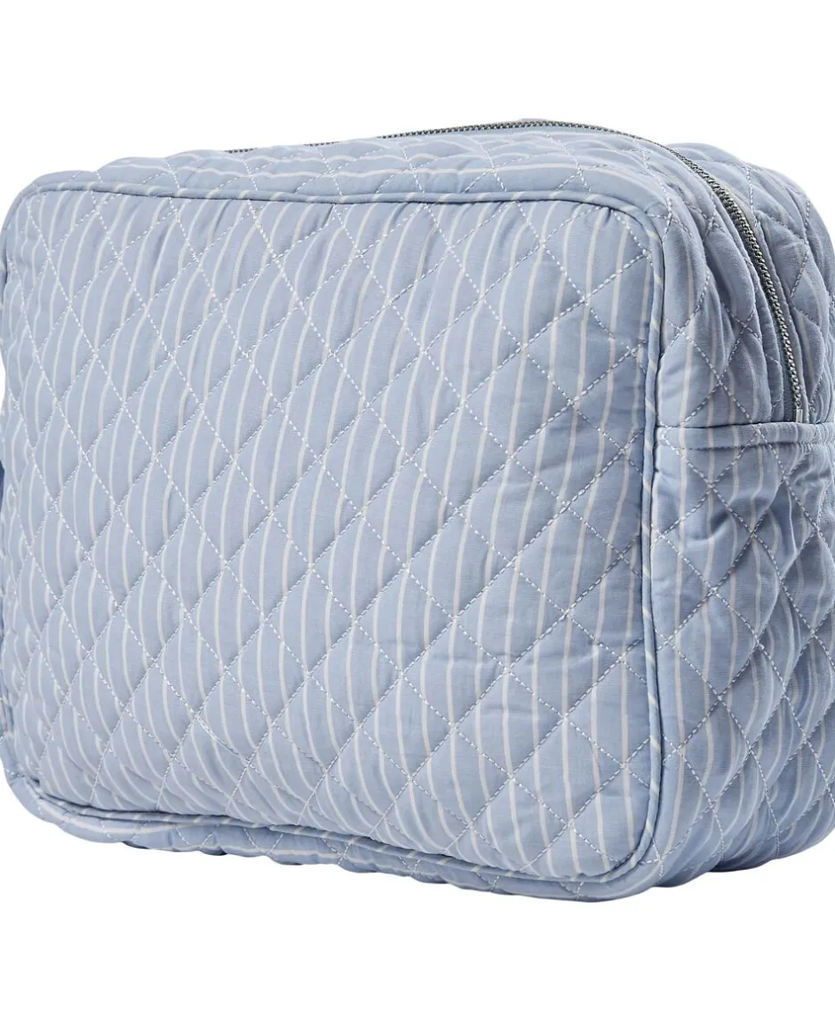 Toilettaske fra Magasin du Nord Collection i den blødeste kvalitet af 80% økologisk bomuld med GOTS-certificering. Toilettasken består af ét stort rum med lynlåslukning samt mindre inderlommer. Derudover har toilettasken fine vatterede syningsdetaljer og et stribet print. En skøn toilettaske i den lækreste kvalitet.
