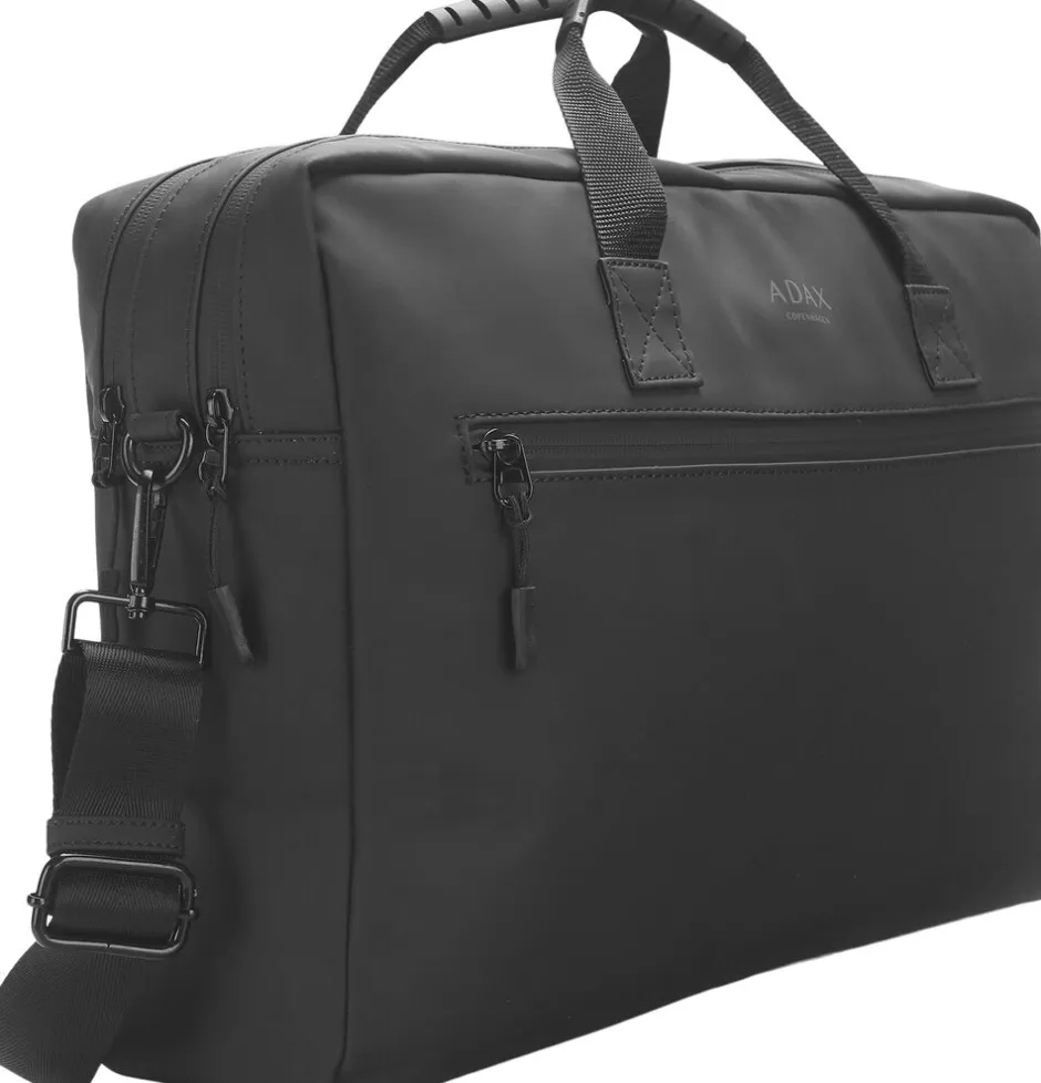 Niki portfolio fra serien Senna er en smart portfolie i vandafvisende nylon. Portfolien har på fronten en lynlåslomme og på bagsiden en strop så man let kan montere tasken på en trolly. Portfolioen har 2 seperat rum, som lukkes med lynlås itoppen. Indvendig findes der en foret lomme med plads til en laptop og i det andet rum en lynlåslomme til småting samt små stiklommer til telefon, kuglepenne mc. Portfolien kan både bæres i de to hanke eller i den lange regulerbare rem. Holder tør ved moderat regn over en kort periode eller let regn over en længere periode. Vandsøjletryk >5000.