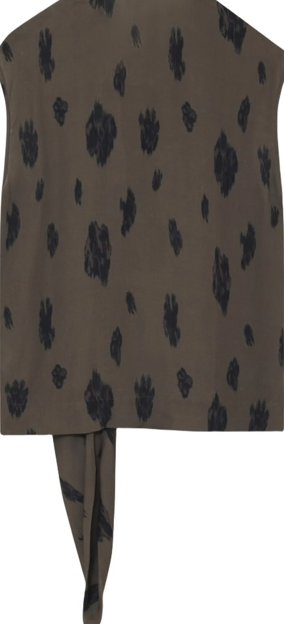Denne top uden ærmer har et forlænget halstørklæde, der draperer asymmetrisk hen over brystet. Toppen har en almindelig pasform