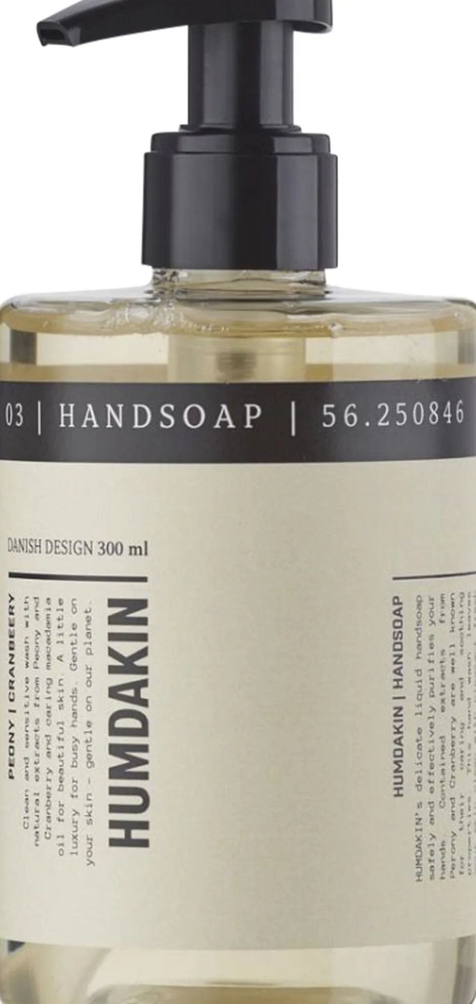 HAND SOAPPeony & cranberry 03A gentle hand soap with natural extracts of peony and cranberry, which leaves your hands moisturized with a pleasant fresh scent. A little luxury for busy hands. Gentle on your skin – gentle on our planet.This delicate liquid hand soap contains natural extracts of peony and cranberry. Peony and cranberry contain softening and firming properties. The antioxidants and vitamin C present in the cranberries boost the collagen production, which makes your skin firm and radiant. This hand soap is enriched with macadamia oil and panthenol, which are especially helpful for irritated and dry skin. The HUMDAKIN hand soap with peony and cranberry helps soften and moisturize your hands in every wash.