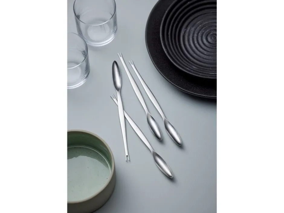 En flot og elegant hummer- og skalddyrsgaffel. Udført i matpoleret rustfrit stål i en gaveæske, som indeholder 4 stk. En slank gaffel med et aflangt laffet i den ene ende og to tænder i den anden. Det perfekte redskab, til at få kødet ud af klør, ben, skald og andre små steder på hummere, krabber og andre skalddyr.