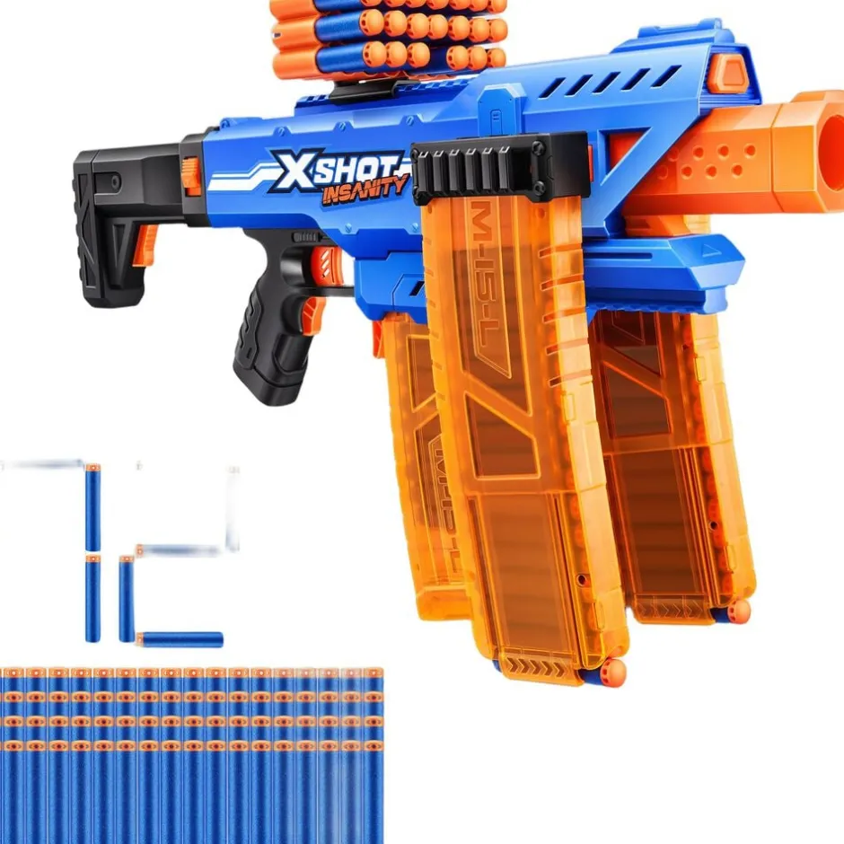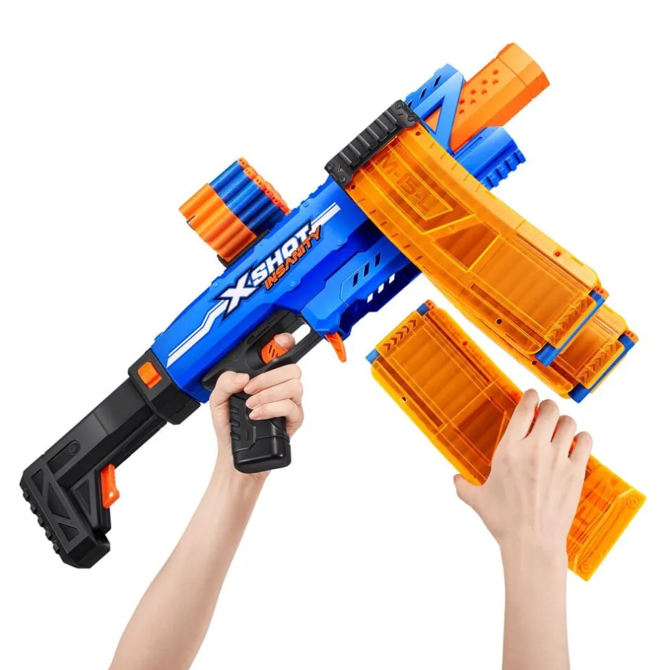 Vanvittige kombinationer, ammunition og action med XSHOT Insanity Tag dine blasterkampe til NÆSTE NIVEAU med XSHOT Insanity Motorized Clip Mania Denne blaster l everes med 3 klip og klipforlængere, så du aldrig behøver at genlade Fuldt motoriseret for endnu mere sprængkraft, affyrer op til 30 meter væk på få sekunder Ko mbiner med andre XSHOT Insanity-blastere for at lave nogle episke blaster-kombinationer