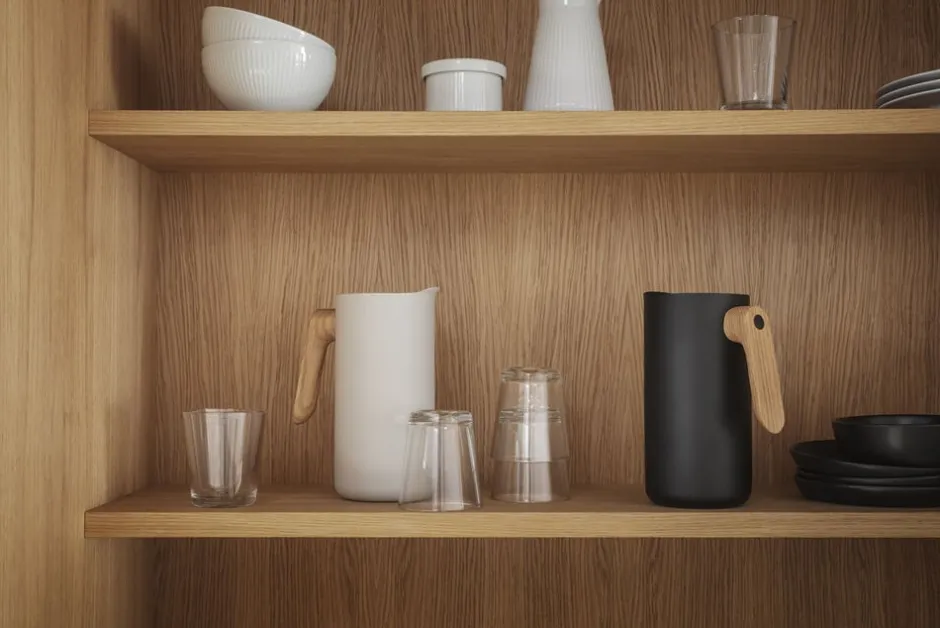 Praktisk serveringskande rummer hele 1,4 l. , men syner mindre. Håndtag i olieret træ understreger det elegante nordiske design, som både gør kanden lækker at hælde af og servere fra – og stille frem på bordet. Vaskes op i hånden.