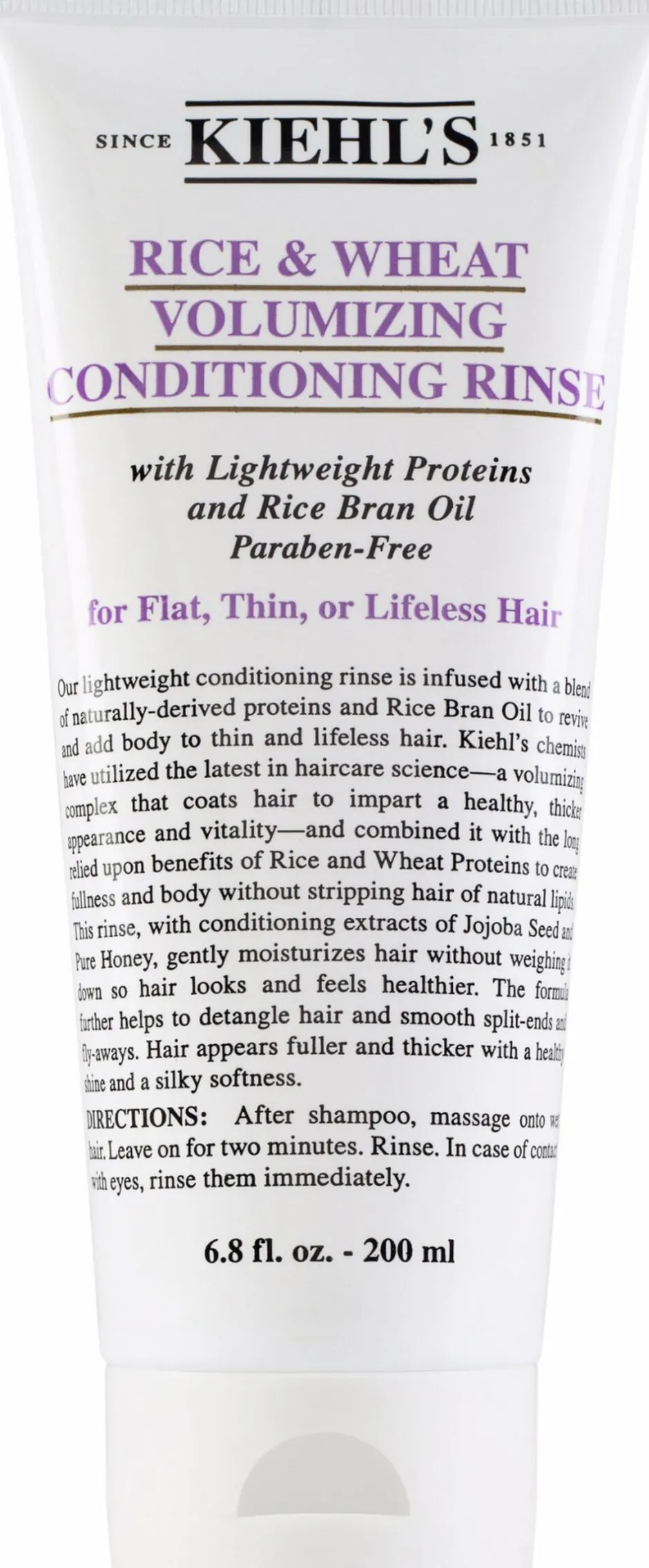Kiehl’s Rice & Wheat Volumizing Conditioner. Genopliver fint og livløst hår, giver volumen og vitalitet, uden at udtørre håret. Hjælper yderligere mod flyvsk hår og ødelagte spidser. Indeholder bla. naturlig proteiner og poly-sukker, ris, hvedeproteiner, honning og jojobafrø.