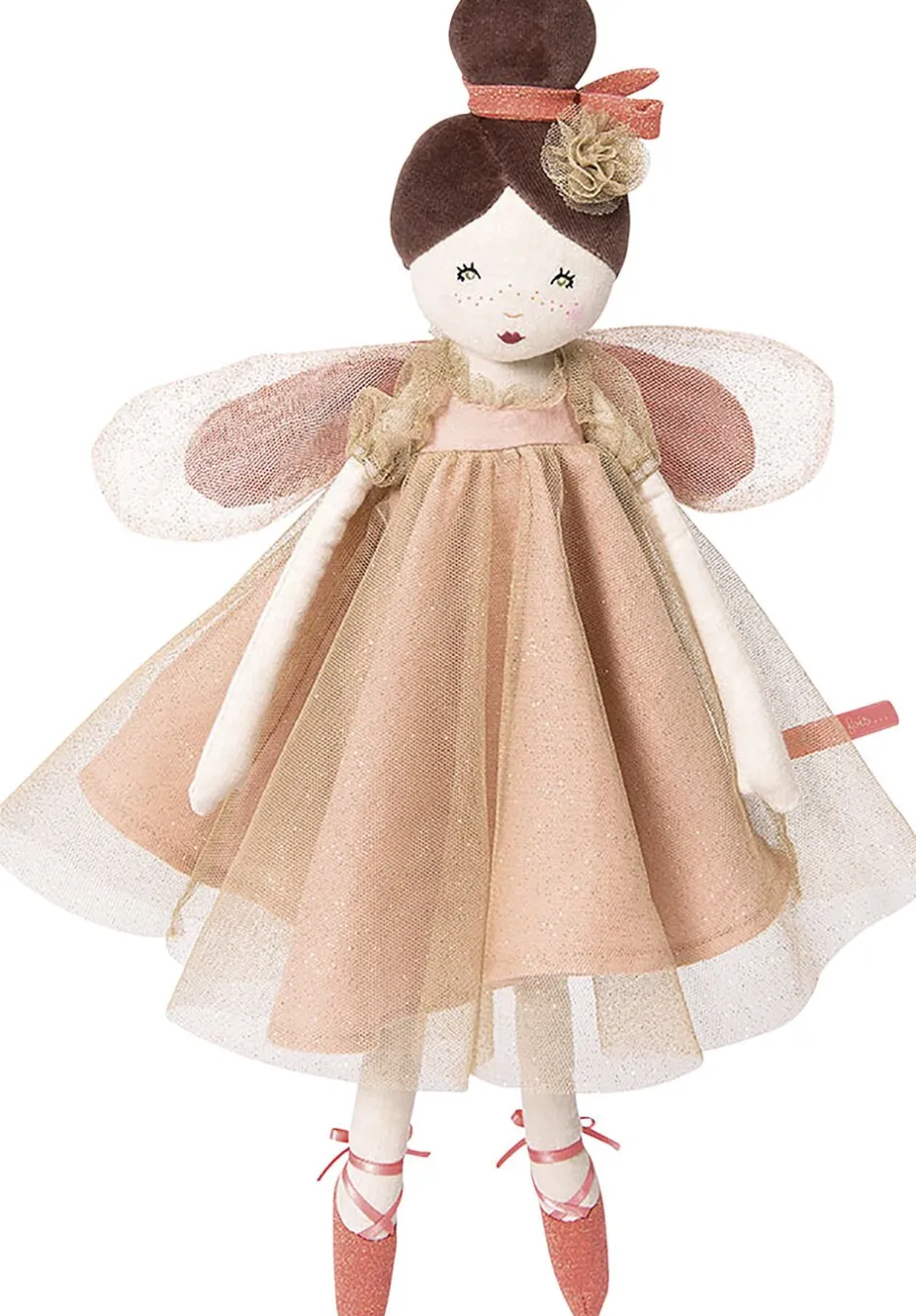 En yndig fortryllende fe. Denne fine kludedukke har etsmukt broderet ansigt. Hun er iklædten pudderfarvetkjole med tyl, har småfe vinger og fineballetsko med satin bånd.