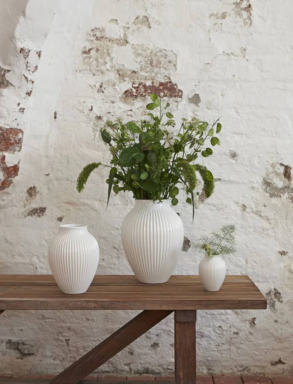 Gennem tiden har Knabstrup Keramik produceret et utal af smukke vaser i forskellige formgivninger. Denne vase er vi særligt stolte af. Den blev oprindeligt formgivet i slutningen af 1940erne og med sin elegante og klassiske form er vasen et tidløst stykke keramik, der holder stilen langt ind i fremtiden. Knabstrup vasen er designet, så den ikke bare præsenterer sig selv, men også sæsonens blomsterbuketter og grene på smukkeste vis. Nu lanceres vasen med riller, hvilket giver den klassiske form helt nyt liv og giver et moderne og interessant udtryk, som passer perfekt ind i den nordiske boligindretning.