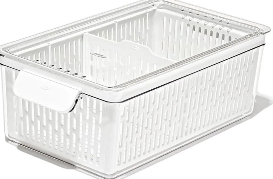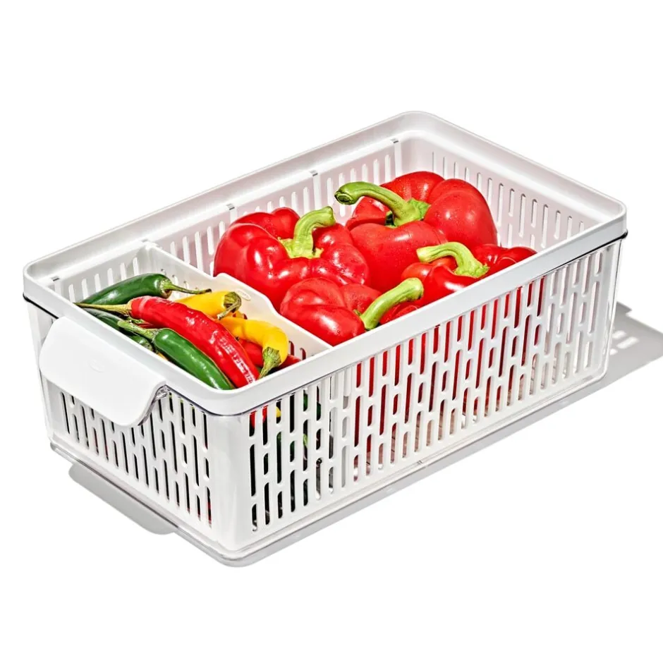 OXO Køleskabsopbevaring er opbevaringsbeholdere designet til at hjælpe med at holde dine produkter i køleskabet friske i længere tid. Mellem beholderen har den perfekte størrelse til bladgrøntsager, peberfrugter, vindruer og anden frugt og grønt. Den justerbare skillevæg holder produkter organiseret og synlige, hvilket hjælper med at reducere madspild slut med at finde en glemt rådden grøntsag bagerst i køleskabet. Den indvendige kurv holder produkterne eleveret og fremmer optimal luftcirkulation, så dine grøntsager holdes friske. Den indvendige kurv er udtagelig, så du kan bruge den til at skylle grøntsagerne. Beholderens komfortable håndtag gør det nemt at tage beholderen til køkkenbordet, og låget, der kan åbnes fra alle sider, giver adgang, uanset om du åbner det i køleskabet eller på køkkenbordet. Låget kan endvidere sættes på højkant på kurvens kant. Mellem beholderen måler 35,1 cm x 18,9 cm x 11,8 cm. Beholderen er BPA-fri, tåler opvaskemaskine og kan stables med andre OXO Køleskabsopbevaringsbeholdere.