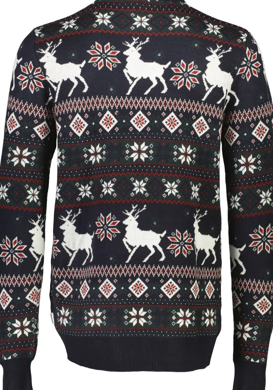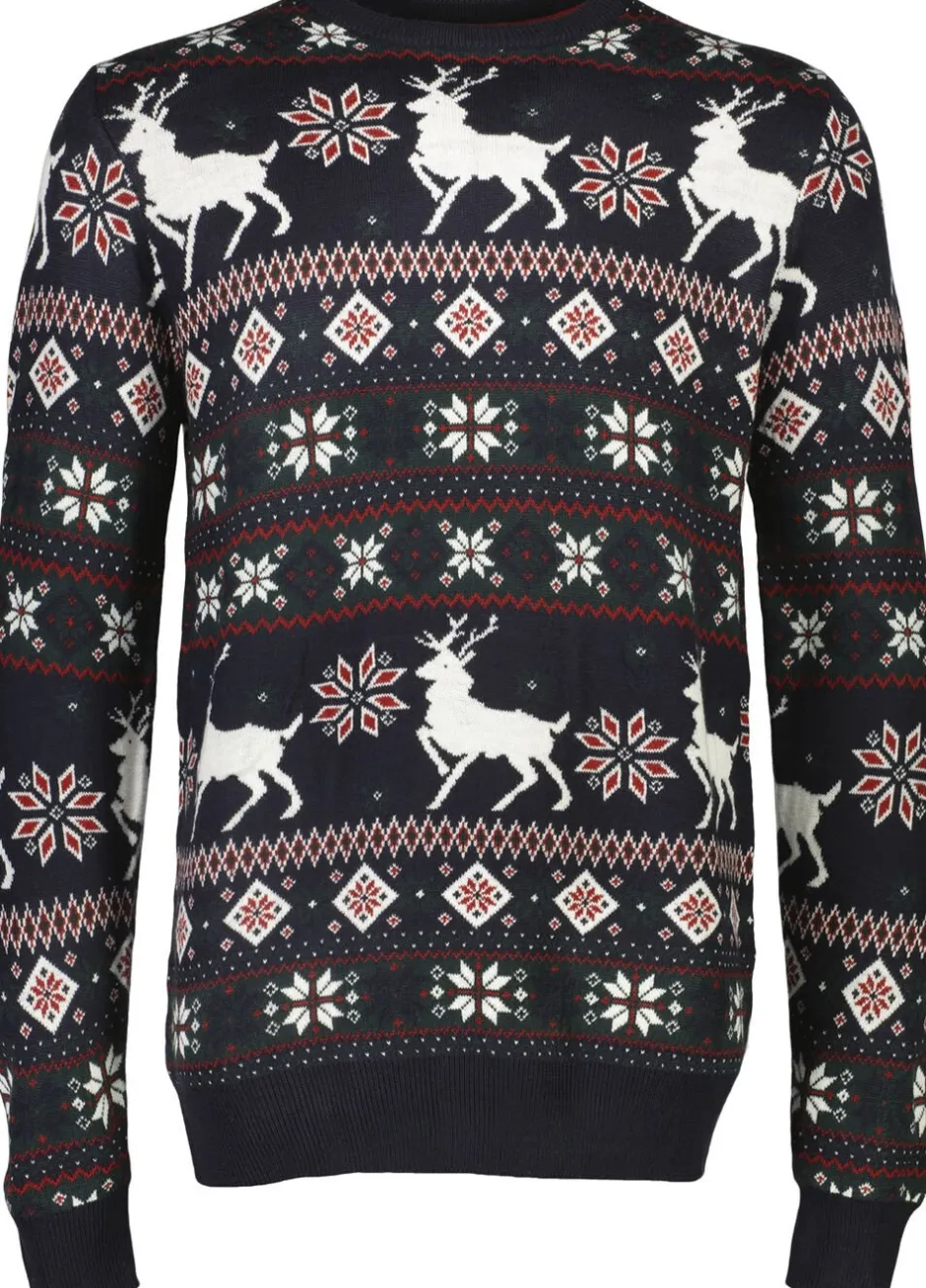Julestriktrøje fra Lindbergh. Trøjen har hyggeligt julemønster på for- og bagside og rund hals. Logomærke nederst på venstre side.