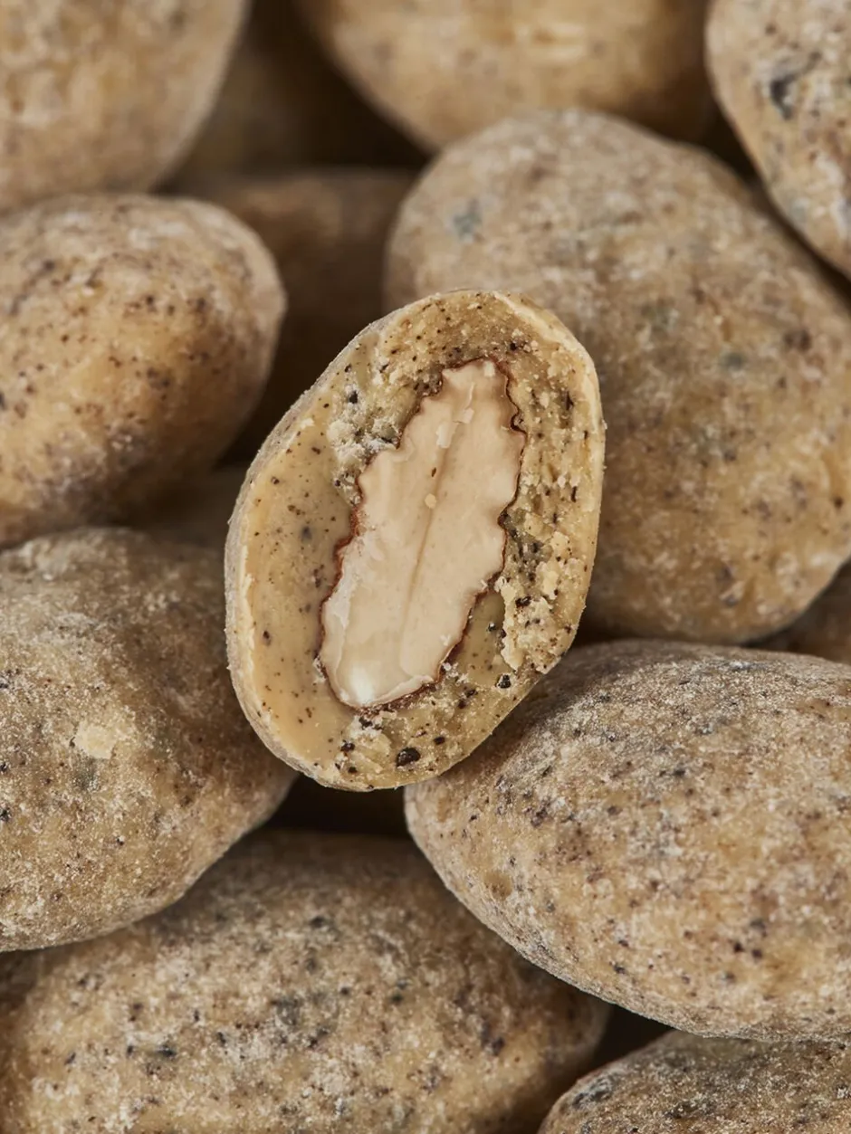 Let ristede økologiske spanske mandler, drageret i Amber Classic-chokolade og granulat af rå lakrids. En mandel med kant fra det italienske lakridspulver, dybde fra den karamelliserede Amber Classic-chokolade og umami fra de sprøde spanske mandler