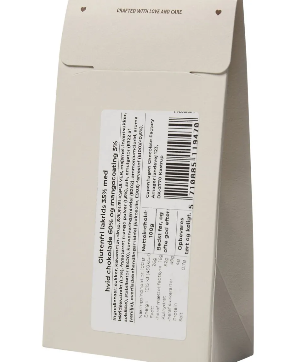 Lakridsdragé fra Magasin du Nord Chocolate med hvid chokolade og mangocoating i en dekorativ æske. Lakridsen er glutenfri, produceret i Danmark og er lavet af udsøgte råvarer. Forkæl dig selv eller en du har kær med denne fine gaveæske.