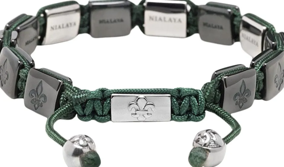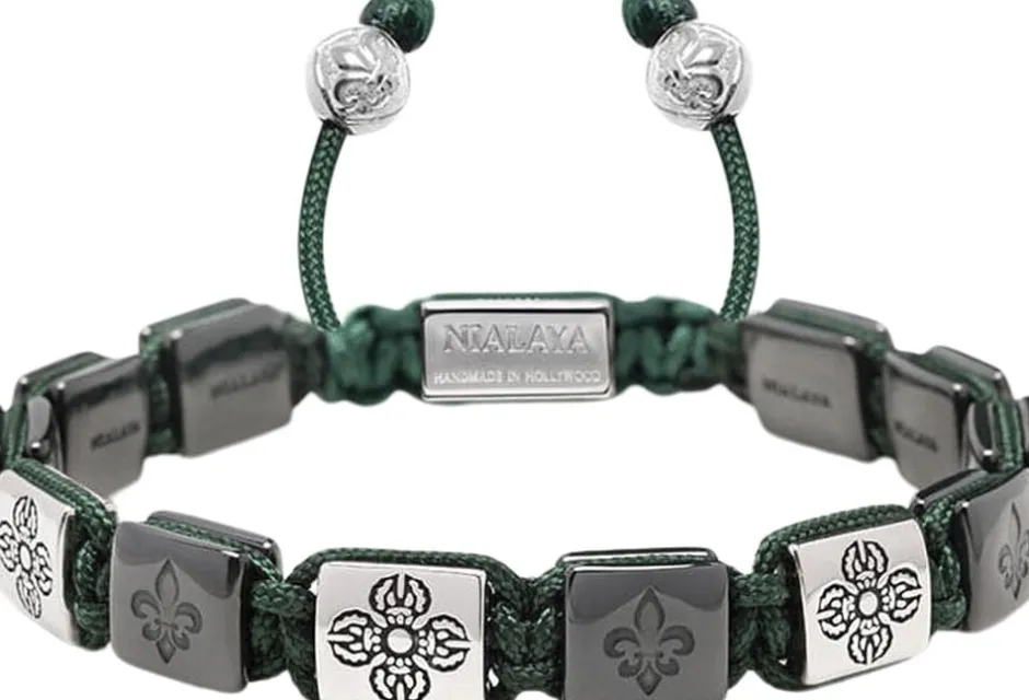 Armbånd med grønne håndlavede keramiske perler, sølvdorjeperler i rustfrit stål. Perlestørrelse: 9 mm x 10 mm. Lås i rustfrit stål. Håndlavet i Los Angeles