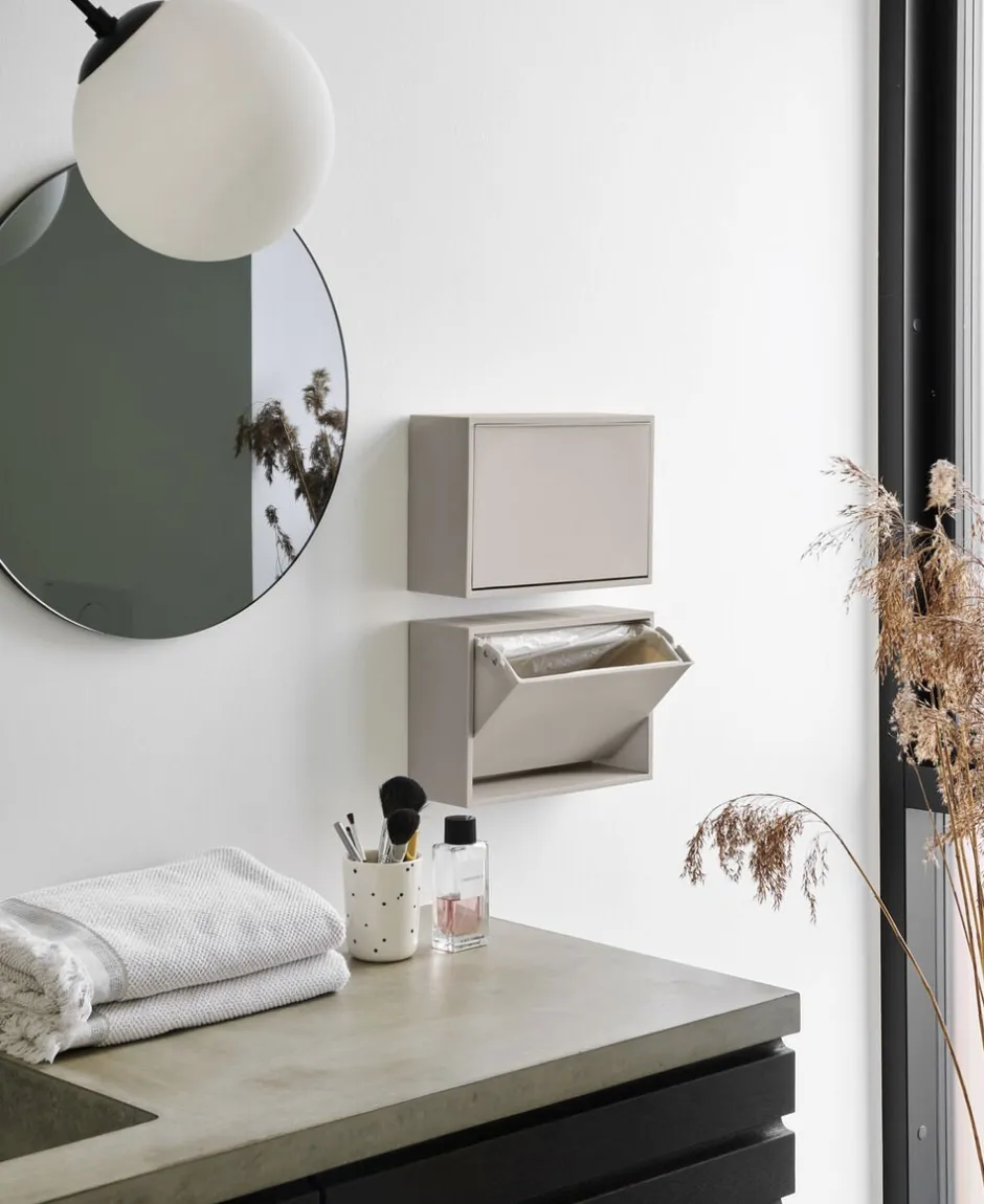 Stilfuld mini boks til opbevaringVores lille opbevaringsboks er perfekt som toiletspand eller til at holde dine småting organiseret på badeværelset eller i andre rum i dit hjem. Boksen er designet som en praktisk løsning, så den er nem at hænge på væggen og boksens overflade kan også bruges som en hylde til dekorative genstande. Vores lille opbevaringsboks er den perfekte løsning til at organisere dine småting på en stilfuld og praktisk måde. Den smarte vippefunktion, der gør det muligt at åbne boksen ved at trykke let i bunden, tilføjer også til bekvemmeligheden og funktionaliteten af denne smarte opbevaringsløsning. Boksen er lavet af genanvendt plast og tilsat mineraler og vi har valgt at producere i Danmark for at undgå lange transportafstande. Den lille størrelse gør den perfekt til at opbevare, sortere og organisere alt fra hårnåle og elastikker til smykker, børnenes tuscher eller andre småting. Boksen fås i forskellige farver, så du kan vælge den, der bedst passer til dit hjem og din personlige stil. Det robuste materiale sikrer, at boksen er holdbar og kan bruges i mange år fremover. Kort sagt er vores lille opbevaringsboks den ideelle løsning til at organisere dine småting på en stilfuld og praktisk måde. Materialer og målGenanvendt PP-plast og mineraler Bredde: 30 cmHøjde: 20 cm Dybde: 10 cm Vægt: 1,2 kg Volumen: 4 literVedligeholdelseOpbevaringsboksen rengøres med en blød, fugtig klud eller svamp. Hvis det er nødvendigt, tilsættes en mild opvaskesæbe eller almindelig sæbe. Tørres af med en ren, tør klud.