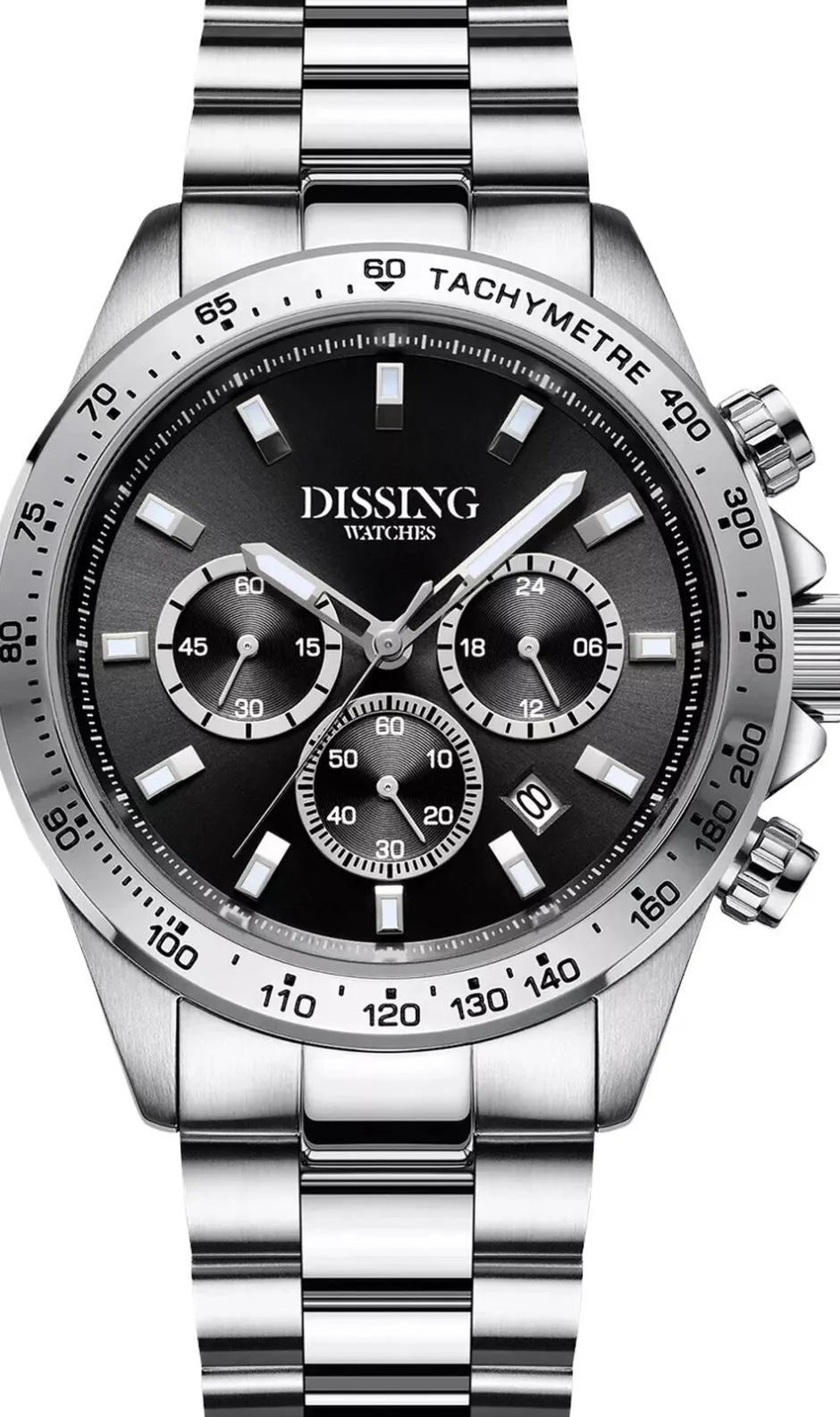Dissing MK9 D1203 er et imponerende ur, der kombinerer robust funktionalitet med et slankt design. Med en diameter på 43 mm skiller dette ur sig ud på håndleddet. Den runde urkasse er suppleret med en detaljeret bezel med en tachymeter-skala, der tilføjer et dynamisk touch til udseendet. Den sorte urskive er udstyret med tre kronografer, hvilket forstærker dets avancerede look. Sølvfarvede visere og timemarkører giver en klar kontrast, der sikrer let læsbarhed. Uret er udstyret med et kvarts urværk drevet af TMI VD53 kaliber.
