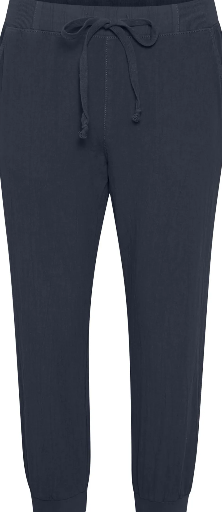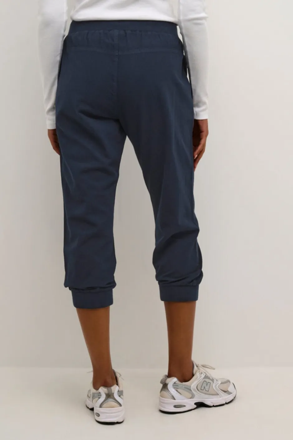Virkelig behagelige cropped bukser fra KAFFE Bukserne har en længde til under knæet med ribkant Bukserne har derudover en lækker 1 bomuldskvalitet elastikkant med snore og et regular fit Det er uden tvivl en buks som ud over dens behagelighed