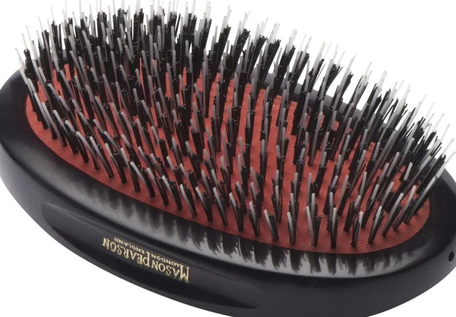 Mason Pearson BN2M er en medium størrelse herrebørste i sortimentet og er lavet af vildsvinehår og nylon. Mason Pearson børsten i vildsvinehår og nylon anbefales fra normal til tykt hår. BN2M er specifikt designet som en herrebørste, Military style betyder at børsten ikke har et håndtag og er genereltkraftigere og mere maskulin i sit udtryk. En Mason Pearson børste masserer og stimulerer hovedbunden, hvorved hårbundens naturlige olier bliver frigivet. Ved gennembørstning bliver olien fordelt ud i længden af håret, så håret får en naturlig glans, samt fylde i bunden. Mason Pearson anbefaler 100 strøg om dagen – en investering i et godt hår hele livet!